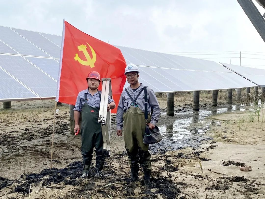 中国节能下属太阳能东台电站工作人员正在东台电站对二期1号塘40号方阵组串进行维护检测工作。