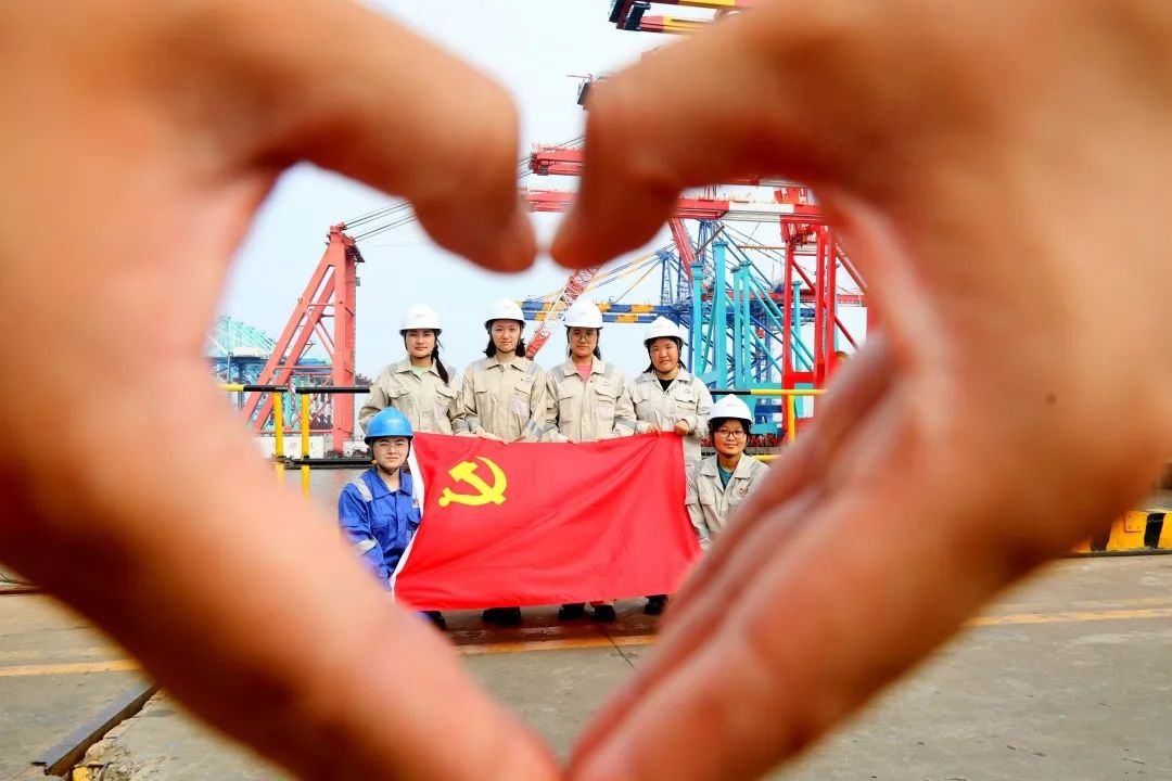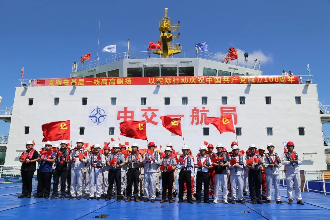 中交集团所属振华重工基层党员代表团在全球著名港机生产基地——长兴基地,庆祝中国共产党成立100周年。