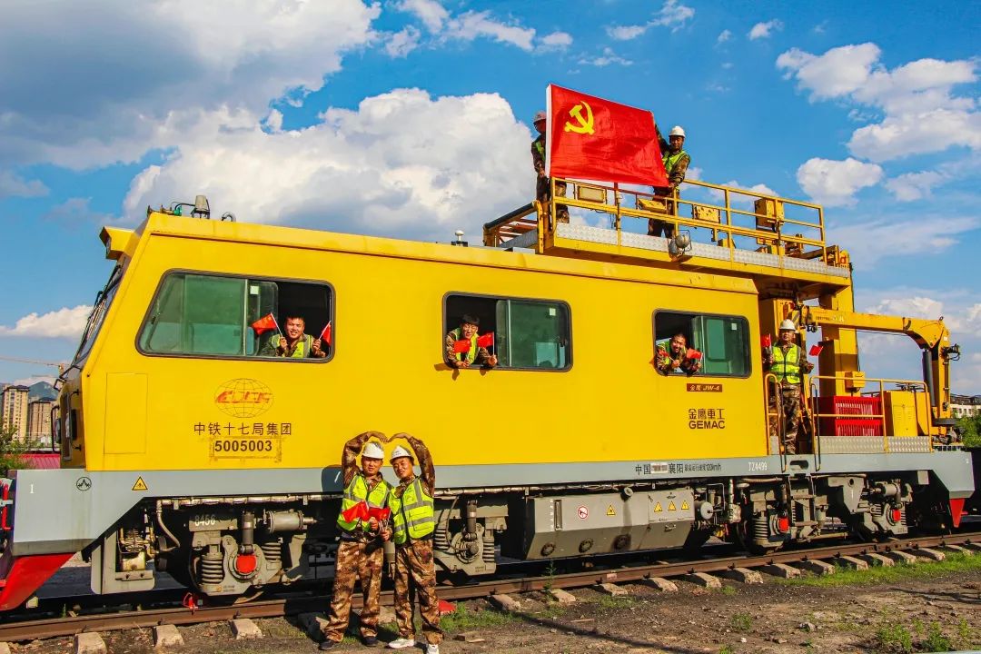 在河北承德,蓝天白云、青山铁轨间,中铁十七局集团京通项目建设者在轨道车上高举党旗、对党表白。