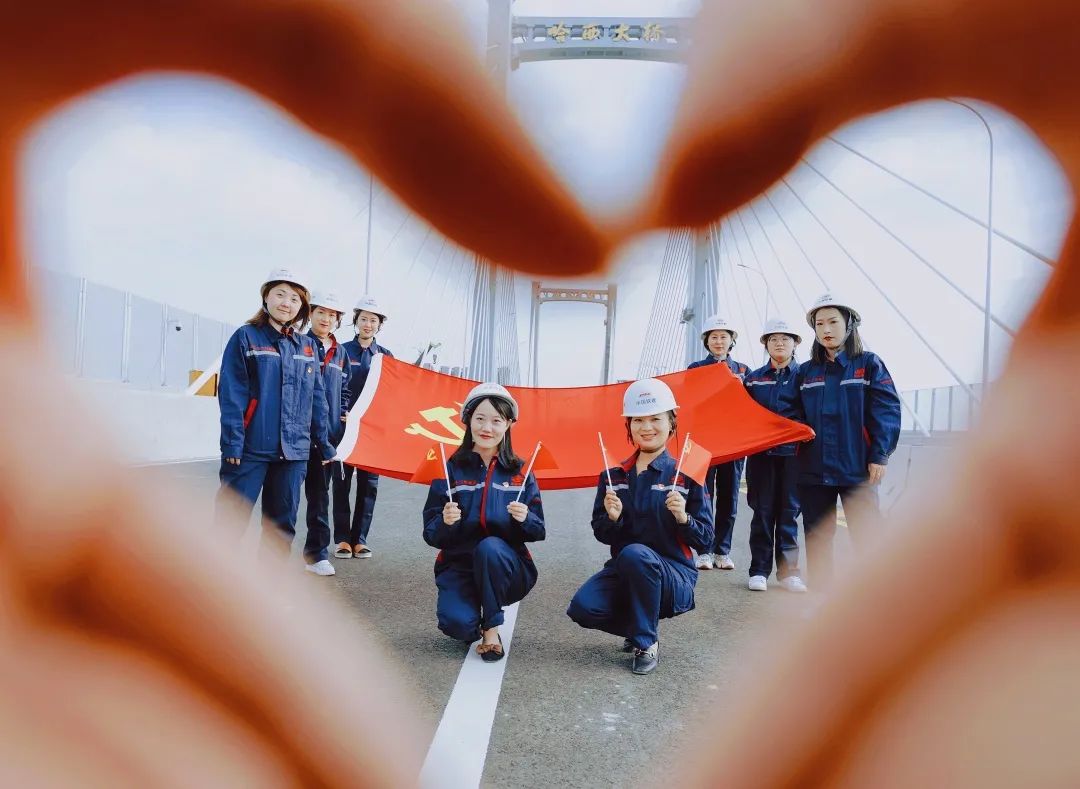 在黑龙江哈尔滨,中铁二十二局集团哈西大街打通工程项目部巾帼女将在即将竣工通车的哈西大桥上向党表白,一心向党。