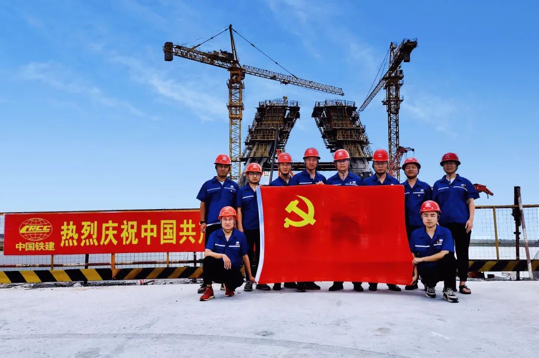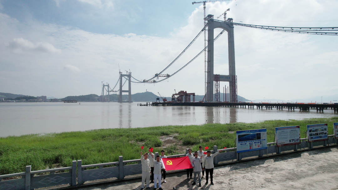 中交二航局承建的世界首座三塔四跨双层钢桁梁悬索桥——温州瓯江北口大桥项目部党员满怀激动的心情,庆祝建党百年。