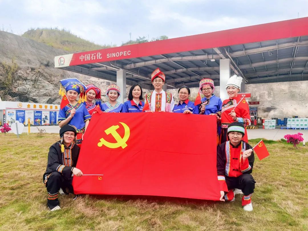 中国石化广西梧州石油青年党员在加油站表达对党和国家的热爱,坚定永葆共产党人先进本色的信念。