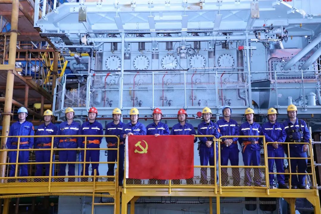 中国船舶中国船柴青岛总装厂党员突击队奋战一线,在全球首台7X82DF双燃料主机前,表达对党和国家的无限热爱。