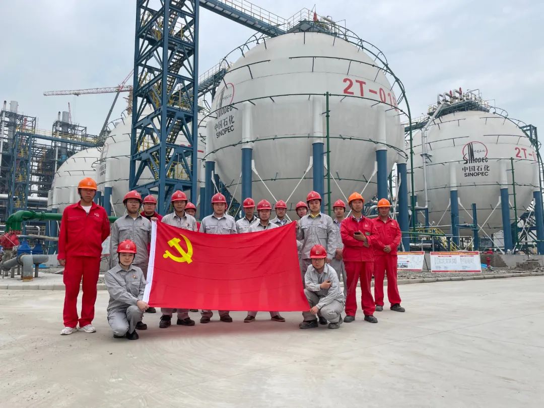 中国石化南京工程公司储运分公司党员在我国最大炼化一体化基地——中国石化镇海基地项目建设现场,祝福中国共产党成立100周年。