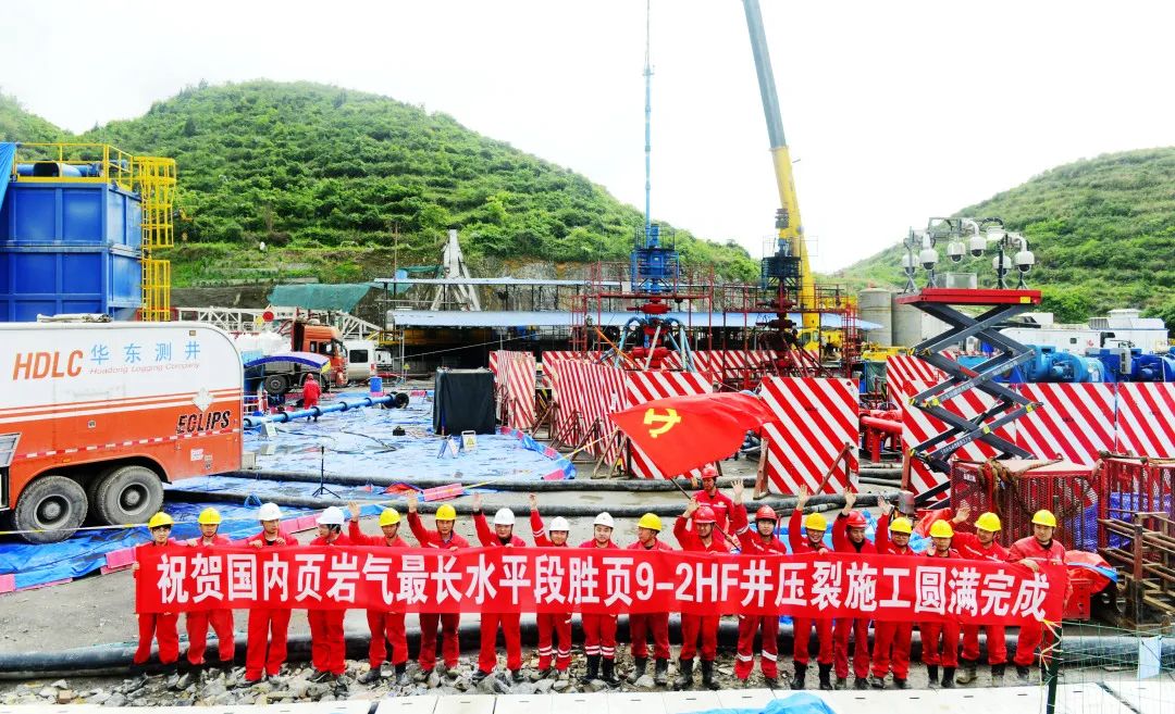 中国石化华东石油局党员干部在重庆页岩气产建区的生产建设一线,庆祝顺利完成国内页岩气最长水平段胜页9-2HF井的压裂施工。