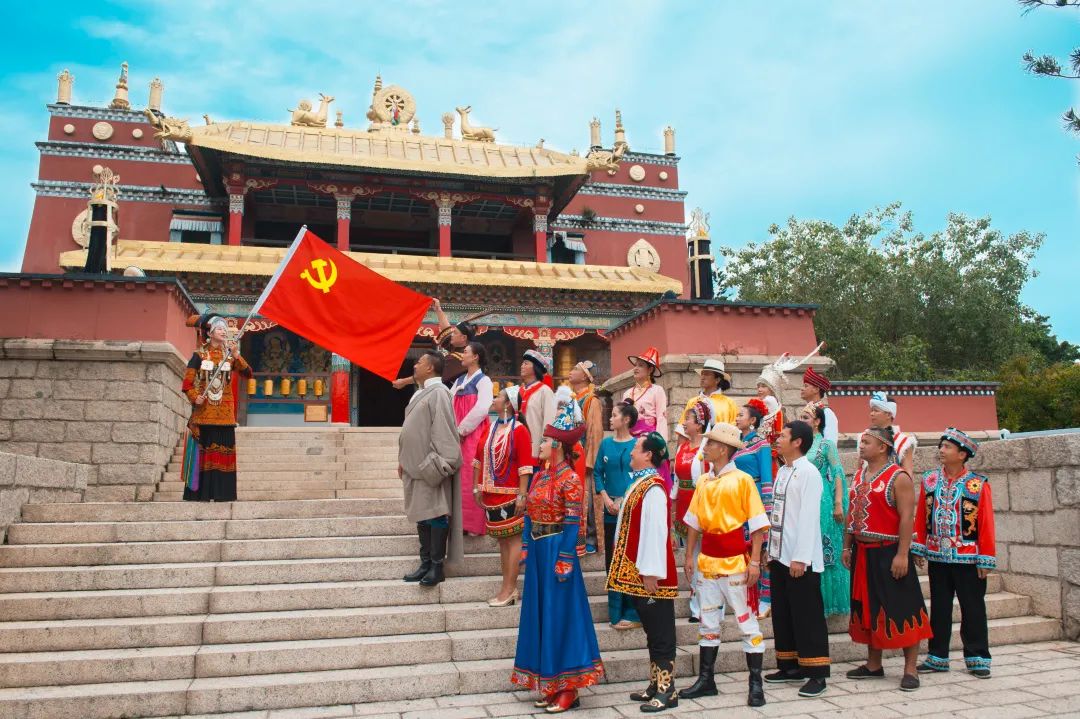 华侨城集团深圳锦绣中华·中国民俗文化村村寨管理党支部与民族职工在藏寨与党旗合影。