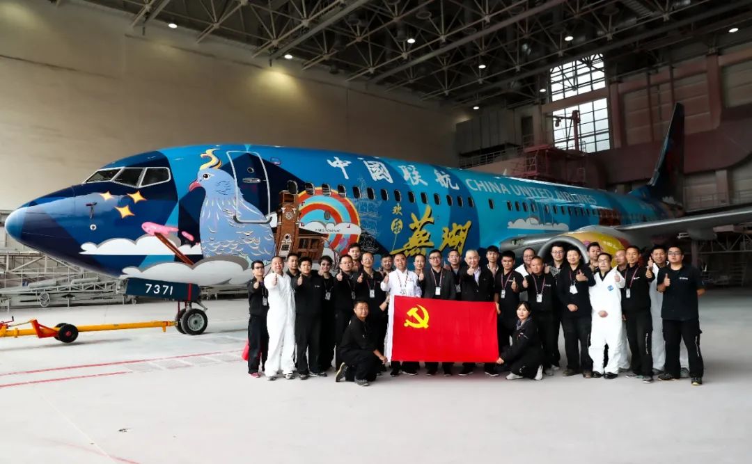 东航集团技术人员在云南维修基地完成“欢乐芜湖号”飞机喷绘作品后,把最好的祝福献给党。
