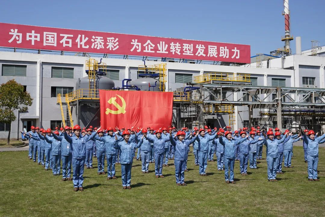 中国石化上海石化团员青年在碳纤维事业部草坪上,伴随绿草茵茵,表达对党和国家的无限热爱。