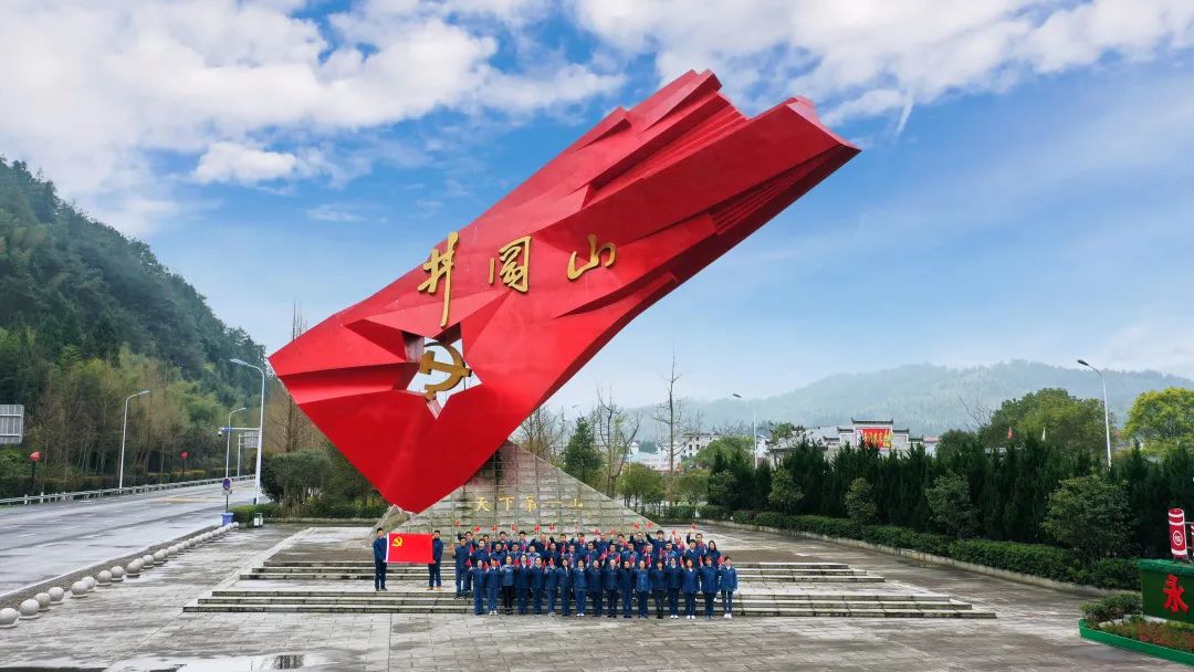 中国华能井冈山电厂党员手持党旗,在井冈山缅怀先辈。