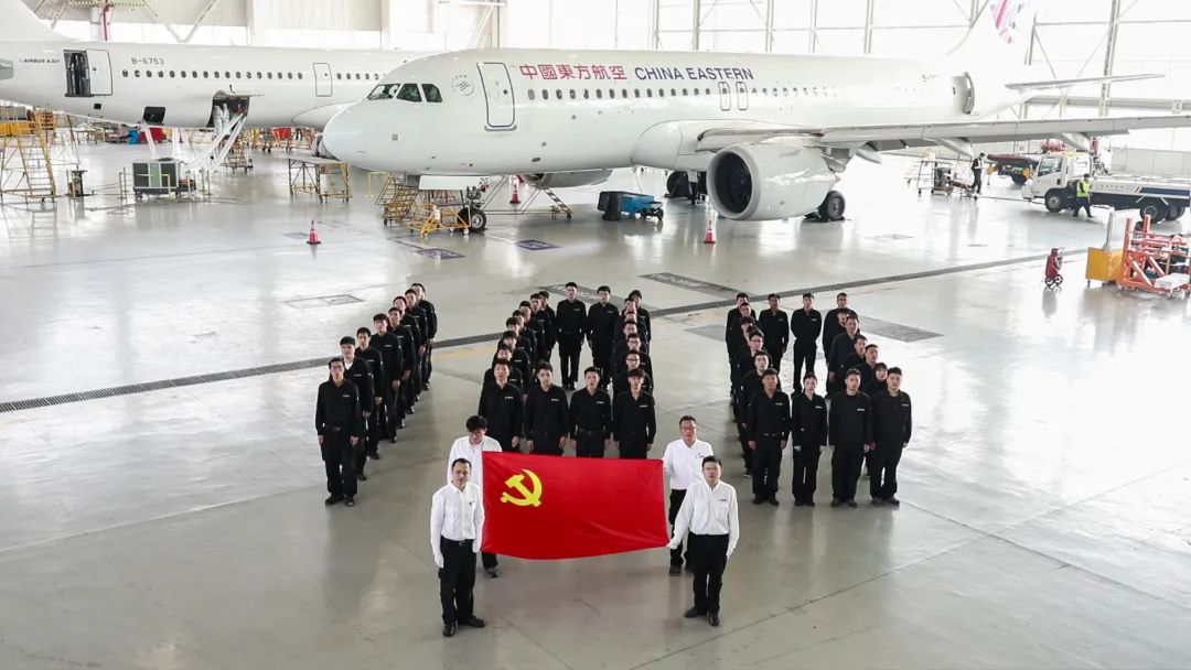 东航集团机务人员在上海虹桥维修基地,为党祝福。