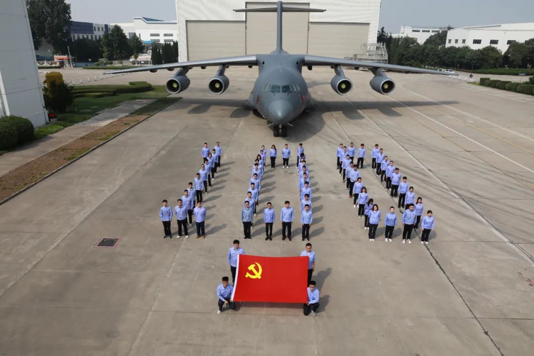 中航西飞基层一线党员干部在大型运输机运20前,表达对党和祖国的热爱。