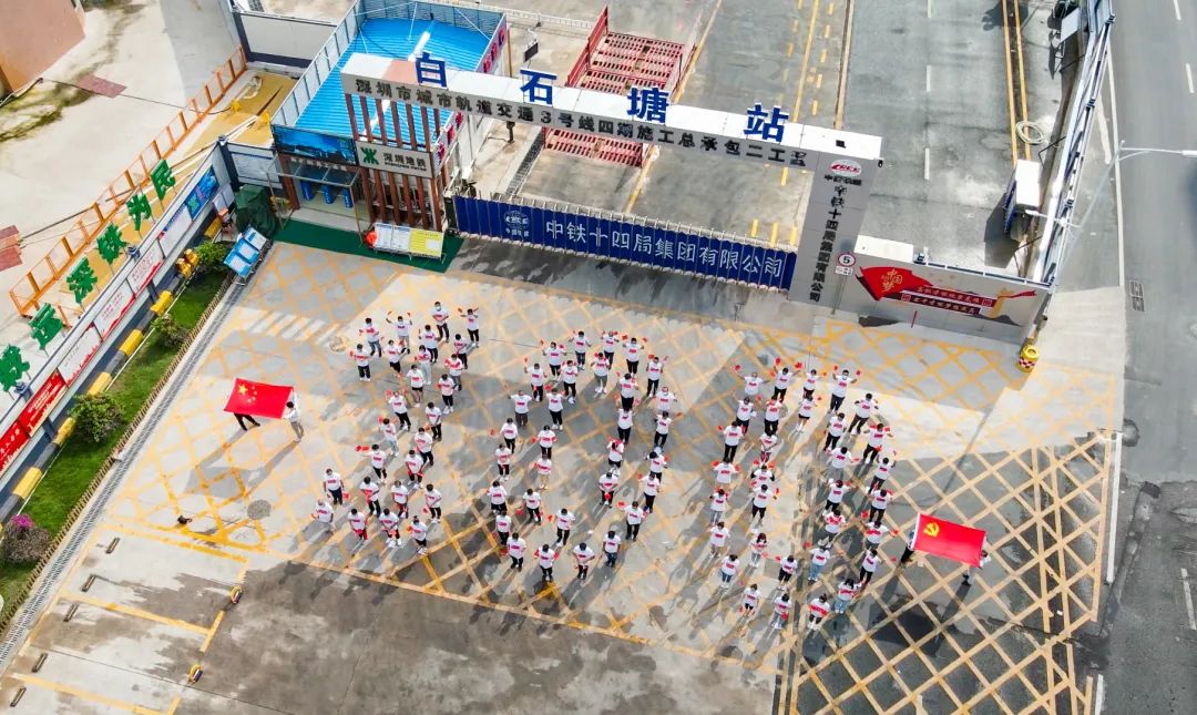 在鹏城深圳,中铁十四局隧道公司深圳地铁3号线四期项目部党员、老铁道兵和团员们,手持党旗、面贴党徽,在该项目白石塘工区门口与党旗、国旗同框。