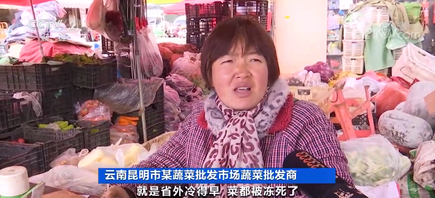 云南昆明市某蔬菜批发市场蔬菜批发商:省外冷得太早,菜都被冻死了,就要从我们昆明采购蔬菜,加上下雨,农民又拔不出那么多货来,所以导致市场缺货,供应不上。