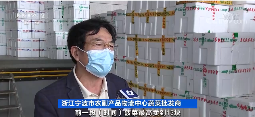 浙江宁波市农副产品物流中心蔬菜批发商:前一段时间,菠菜最高卖到13元,属于往年来价格最高。
