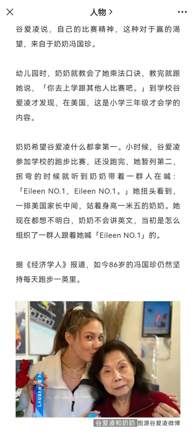 谷爱凌出生后,冯国珍就前往美国开始照顾外孙女的生活。