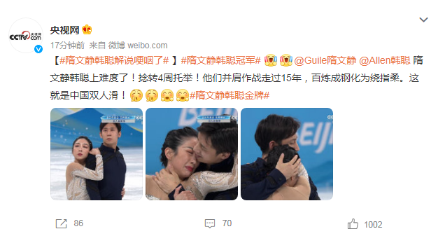 据央视网微博报道,在比赛过程中,解说因感动曾一度哽咽:捻转4周托举!他们并肩作战走过15年,百炼成钢化为绕指柔,这就是中国双人滑!