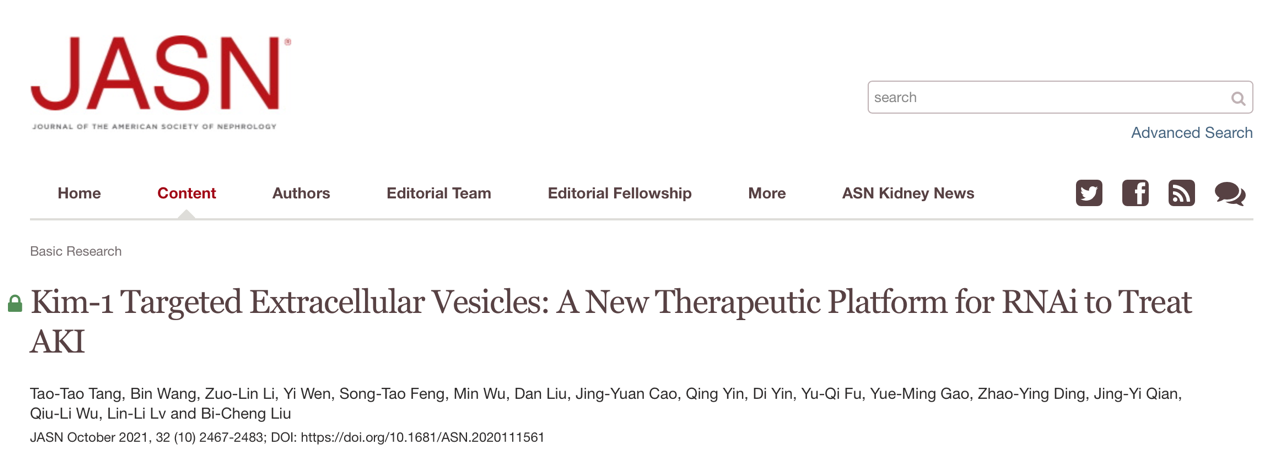 近日,东南大学医学院院长、肾脏病研究所所长、附属中大医院肾脏内科主任医师刘必成教授团队在肾脏病领域TOP期刊美国肾脏病学会杂志JASN在线发表了题为Kim-1 Targeted Extracellular Vesicles: A New Therapeutic Platform for RNAi to Treat AKI的研究论文,首次报道了靶向肾损伤分子-1(Kim-1)的红细胞源细胞外囊泡可作为siRNA的新型递送载体用于治疗急性肾损伤(AKI)及其向慢性肾脏病进展。