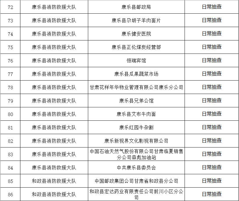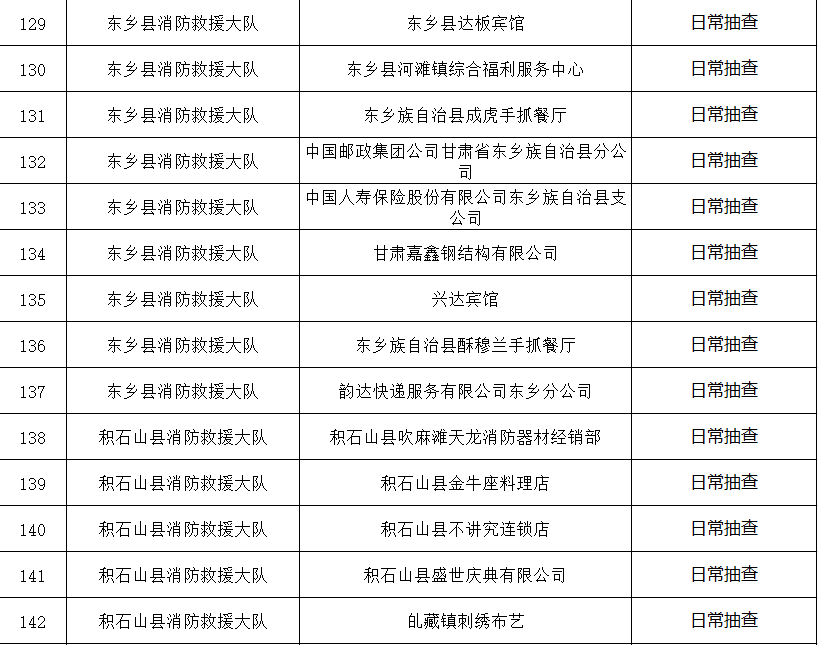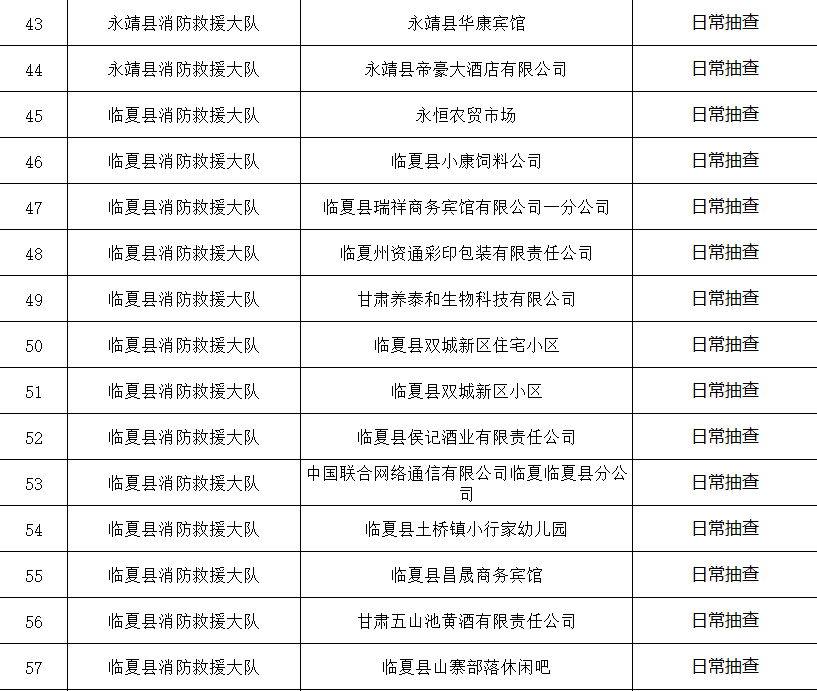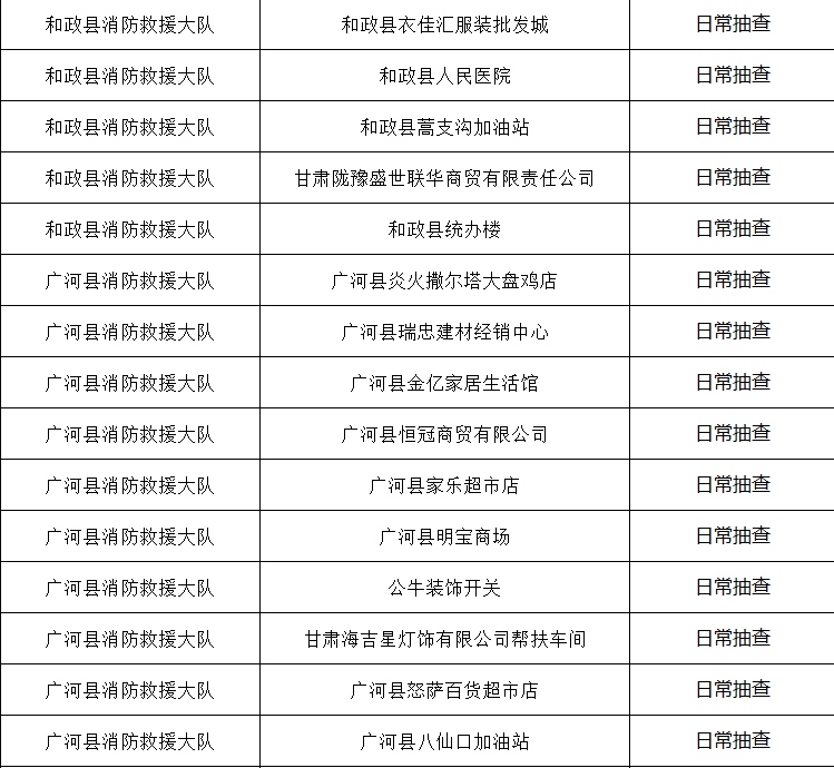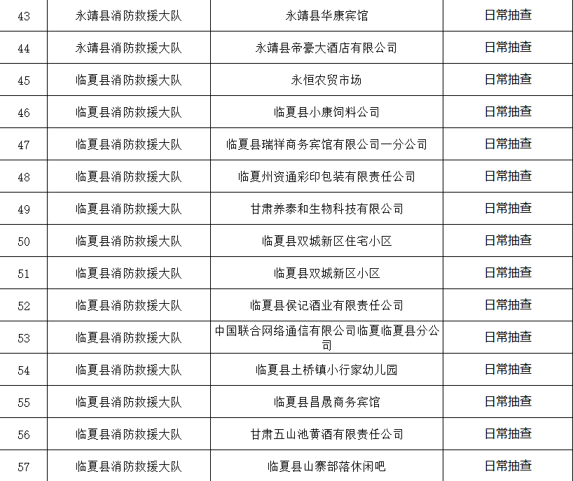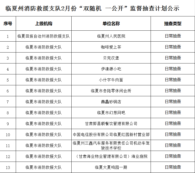 根据应急管理部消防救援局《关于全面推行“双随机、一公开”消防监管工作的通知》及省消防救援总队《全面推行“双随机、一公开”消防监管工作方案》相关要求,现将2023年2月份临夏州消防救援支队“双随机、一公开”消防监督检查对象公示如下: