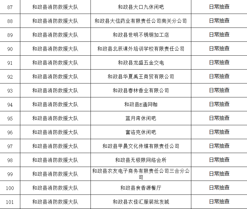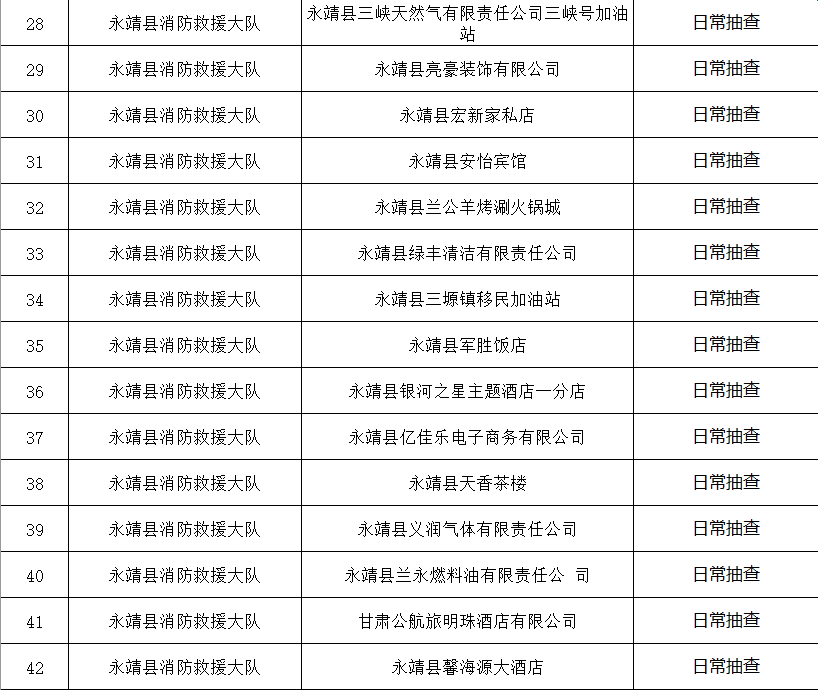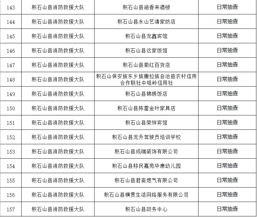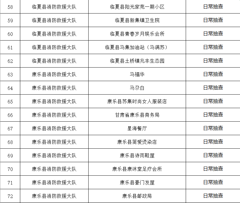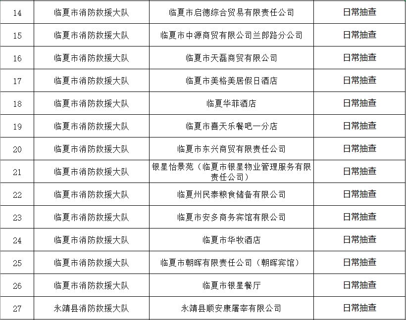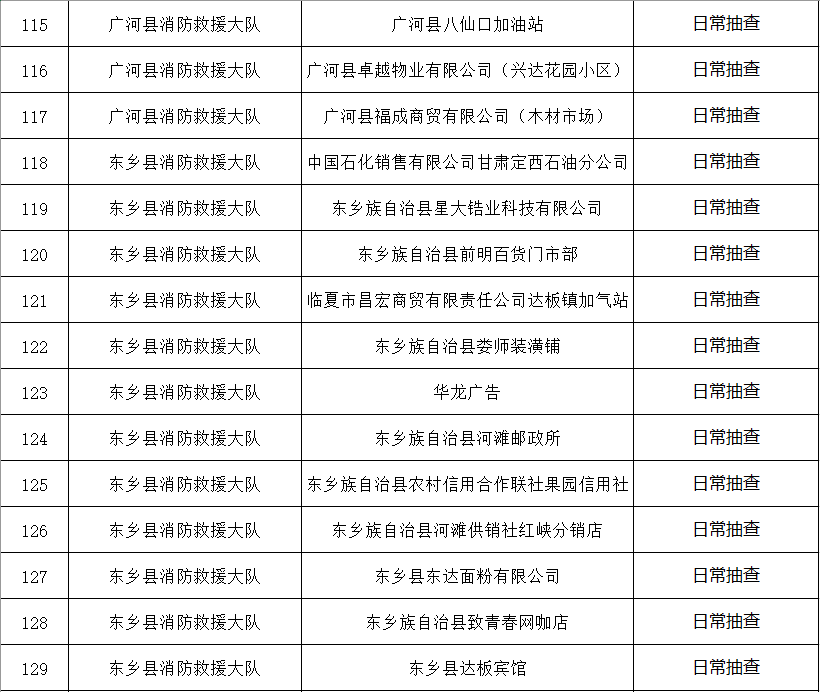 根据应急管理部消防救援局《关于全面推行“双随机、一公开”消防监管工作的通知》及省消防救援总队《全面推行“双随机、一公开”消防监管工作方案》相关要求,现将2023年2月份临夏州消防救援支队“双随机、一公开”消防监督检查对象公示如下: