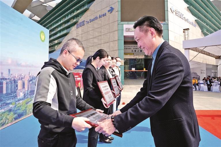 宝安区消委会秘书长刘俊斌(右)为获奖单位颁奖。