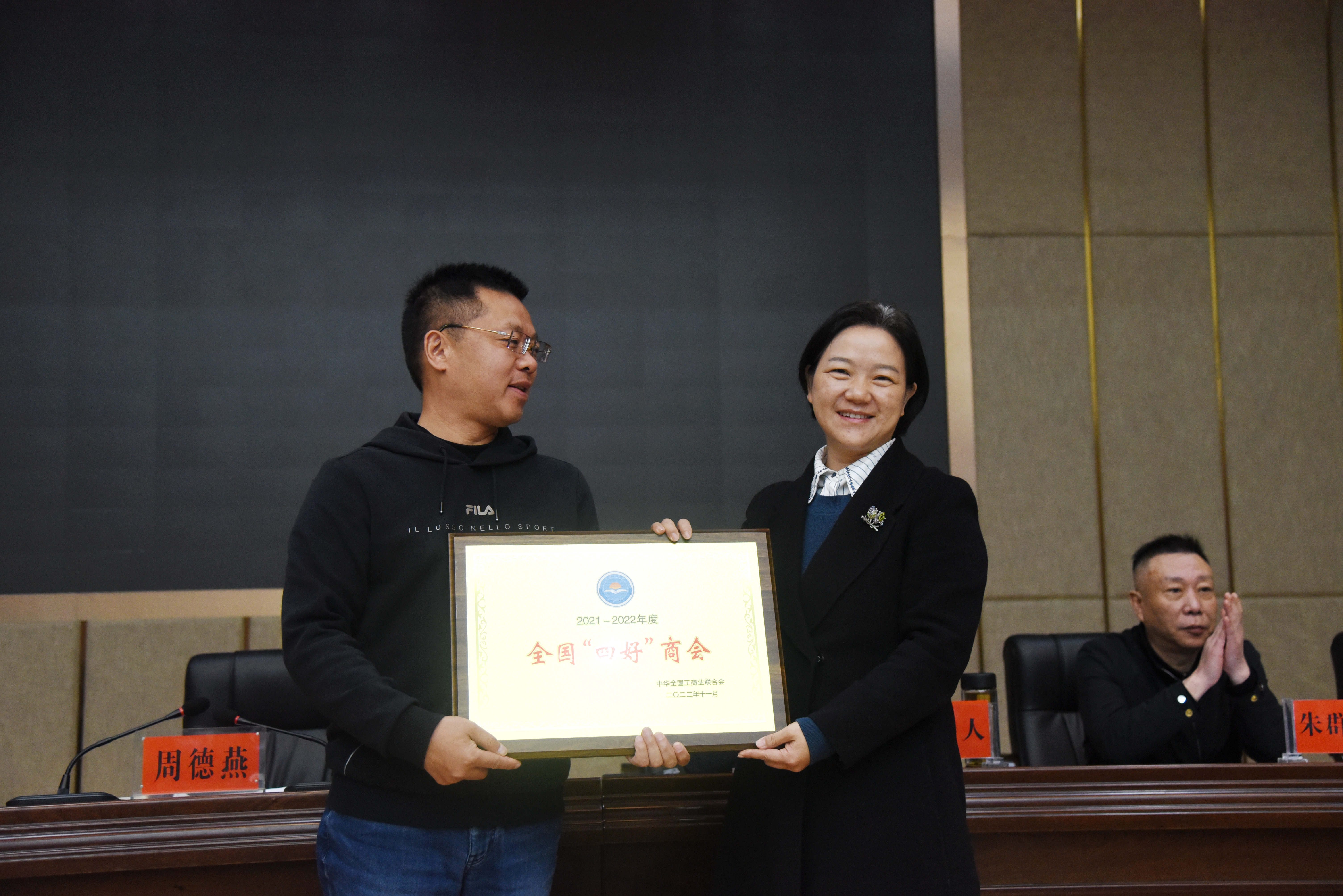 会议为团堡镇商会颁发了全国“四好”商会奖牌,为建南镇、凉雾乡、汪营镇、忠路镇商会颁发了全省“四好”商会奖牌。