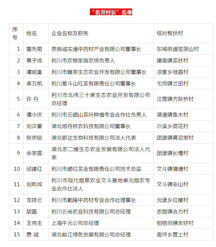 会上,团堡镇商会、汪营镇商会、建南镇商会,湖北省凤茗茶业有限责任公司、湖北龙船大药房连锁有限公司等就去年特色亮点工作作了典型交流发言。会议宣读了《选聘民营经济人士担任“名誉村长”推进“万企兴万村”行动工作方案》和聘任名誉村长名单,并举行了聘任仪式为其颁发聘任证书。恩施诚实通中药材产业有限公司董事长雷先菊、利川市农根家庭农场负责人黄子成、利川市北纬三十度生态农业开发有限公司总经理许丹等15人被聘为“名誉村长”。