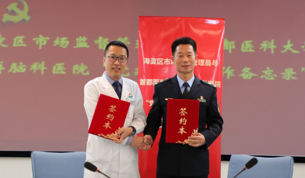 2023 年 4 月 25 日下午,在海淀区市场监督管理局党组书记、局长聂俊杰的带领下,海淀区市场监督管理局一行莅临首都医科大学三博脑科医院,举行了“党建联建合作备忘录”签约仪式。