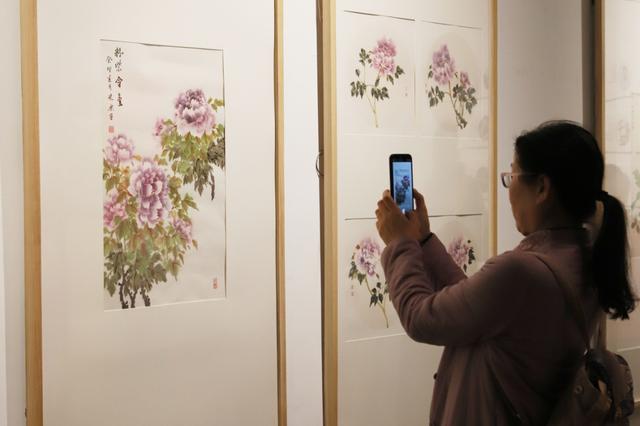 (图:游客在应天门美术馆“花开大唐春·隋唐洛阳城牡丹写生作品展”前驻足拍照马腾奔拍摄)
