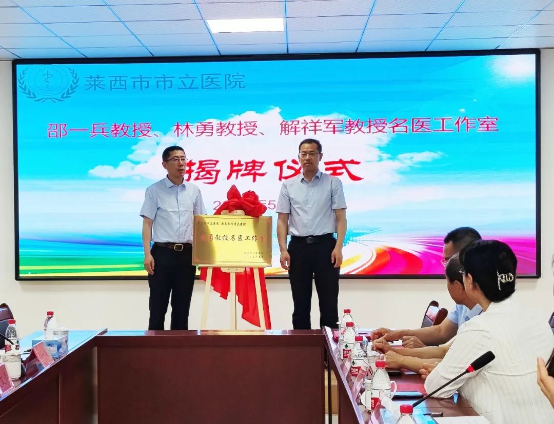 为进一步推动医院医疗技术水平提高、人才培养和医院管理能力,让莱西市民在家门口即可享受到“知名医学专家”的优质诊疗服务,5月30日上午,在莱西市市立医院举行了青岛市市立医院邵一兵教授、林勇教授、解祥军教授名医工作室揭牌仪式。