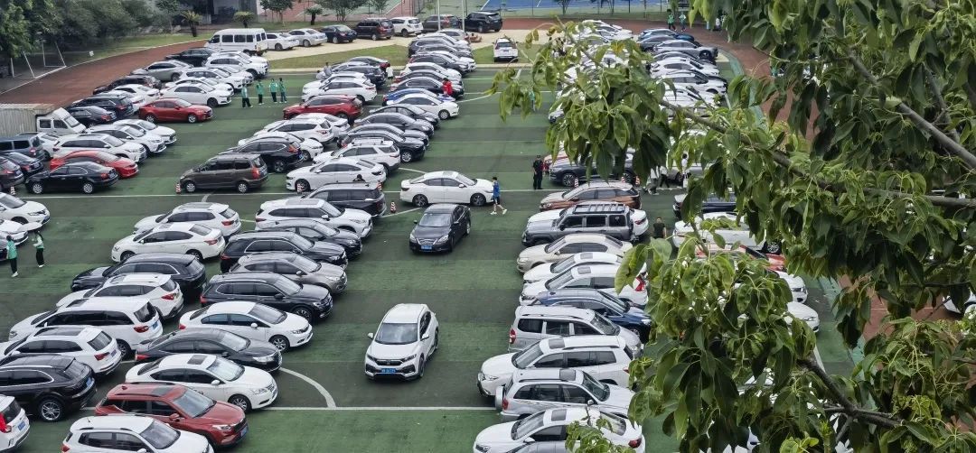 家长接送学生的车辆按照指定位置停放,志愿者向前提供周到的帮助。