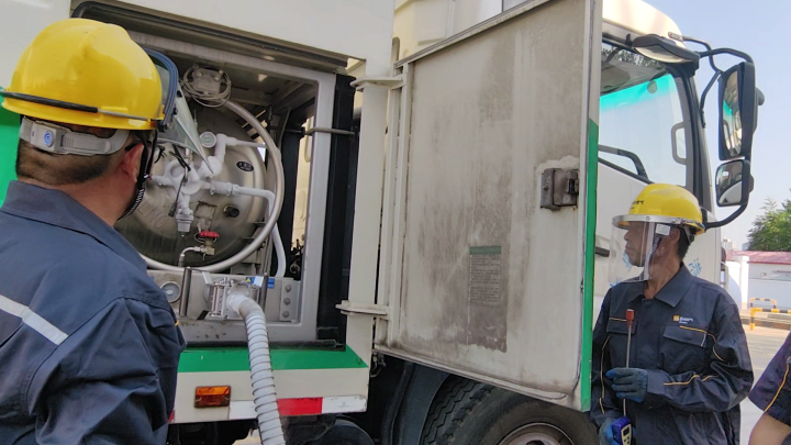 简短的启用仪式后,一辆LNG清扫车缓慢驶入站内,在现场操作人员的指引下,车辆停入加气位。操作人员对车辆进行加气前的安全检查,确认无异常后提起加气枪,将其连接到车辆加气口上,顺利完成了华润燃气西港路加气站CNG/LNG合建站LNG车辆充装的“第一枪”。