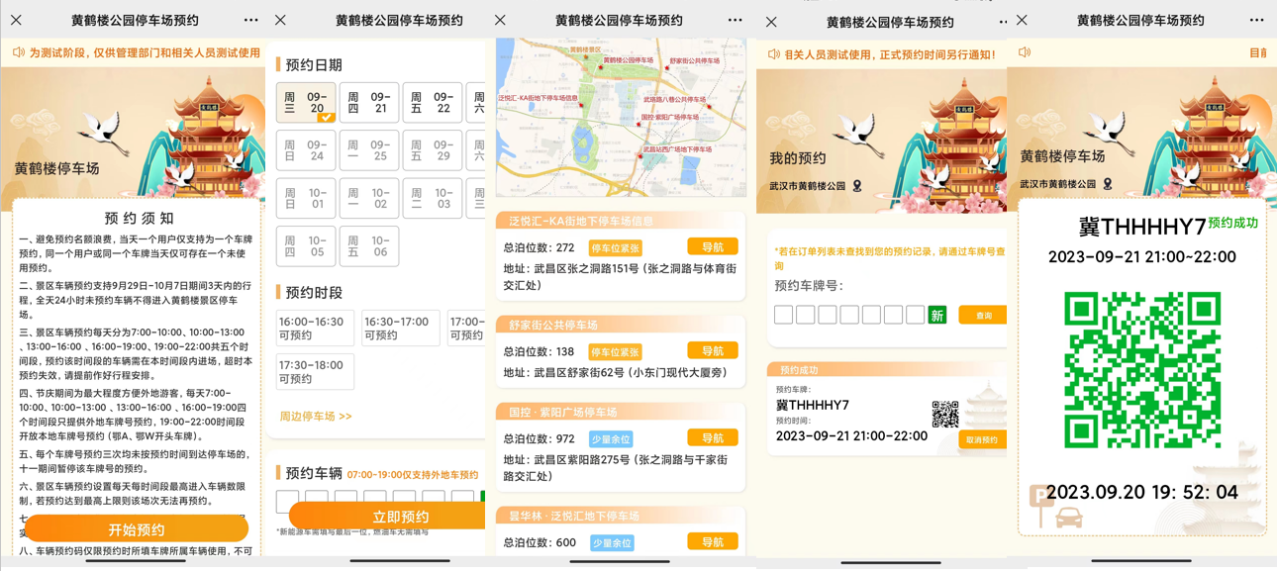 目前,“黄鹤楼停车预约”智慧场景是通过扫码动态预约,提前分流的方式配合路面交通警察现场管制优化景区交通管理模式,避免游玩车辆随意停放、无处停放进而引发大面积、长时间交通拥堵的状况发生,利用数据融合、停车预约、路线指引、周边停车场导航等具体措施缓解道路交通压力,提高路面交通精细化治理水平以适应智慧交管的发展需要,为游客提供更为便捷舒适的出行体验。