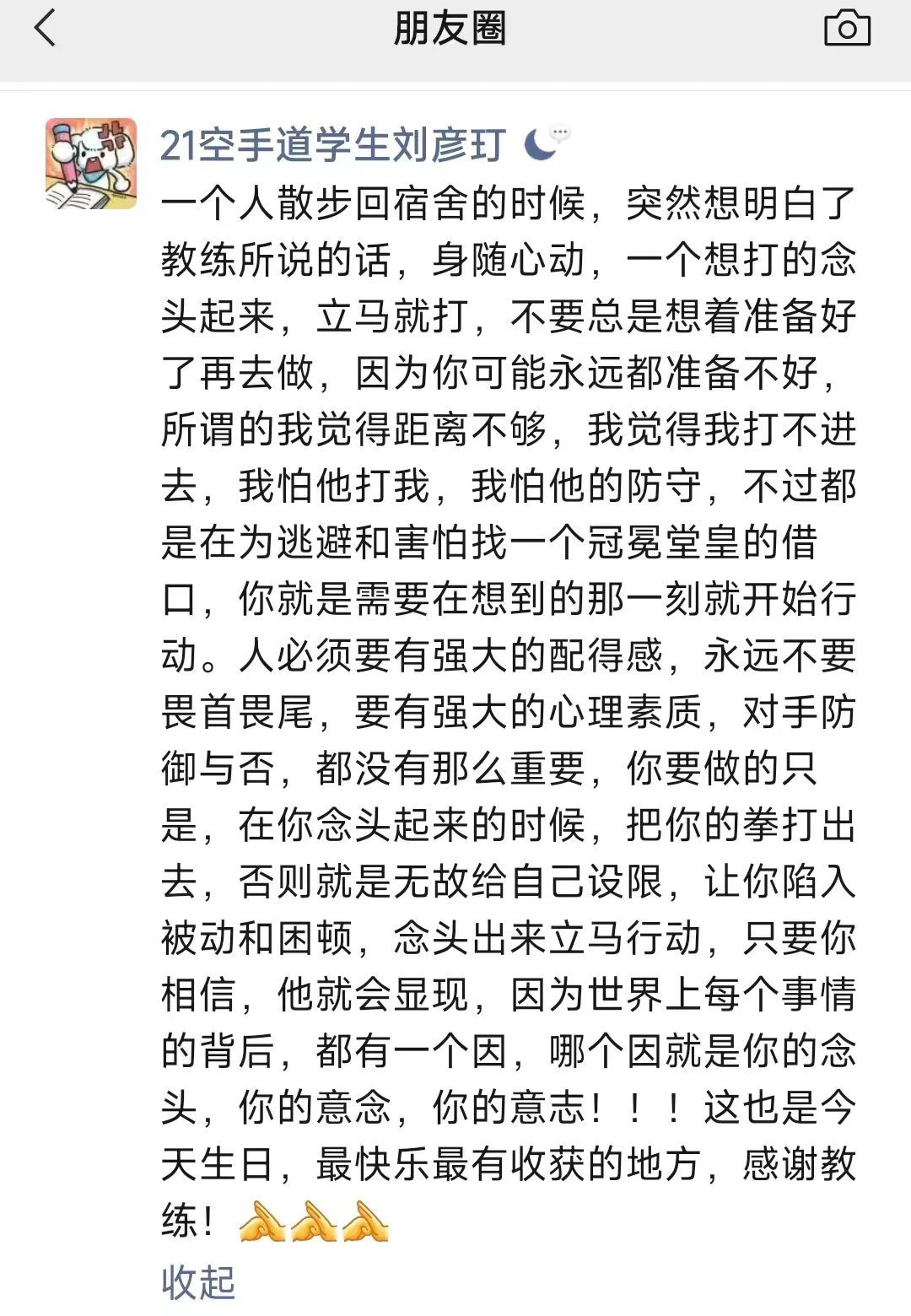 比赛结束后,董刚还会带领队员们回看比赛时的视频,仔细分析场上的优势和不足,帮助队员总结经验与教训。他还时常叮嘱队员要胜不骄,败不馁,忘记自己曾经取得的成绩,放低姿态,回归基础,从头开始,这样才能继续精进技术。就是在这样日复一日的倾情付出中,董刚为学校空手道队培养了以李睿煐为代表的一批又一批的“好苗子”。尤其值得一提的是,有的同学由此爱上空手道,走上了专业化道路。化工学院2012级的陈少林同学在上海经营着一家空手道馆,数大学院2015级的吴浪同学考上了西安体育学院的研究生,现于西安某高校担任体育教师。