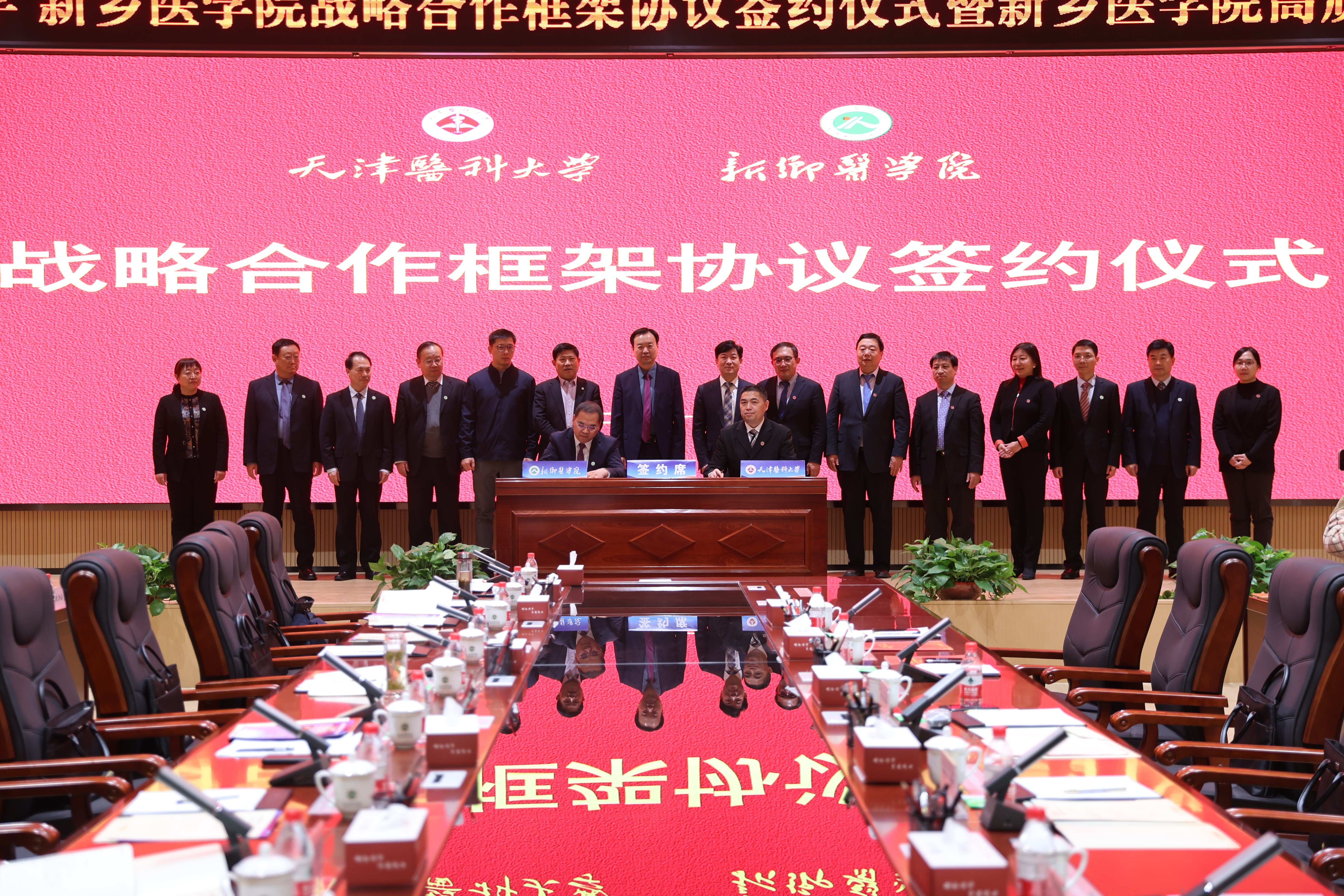 12月11日下午,新乡医学院与天津医科大学签署战略合作框架协议。天津医科大学党委副书记、校长郝继辉,校党委常委、副校长余鹰;河南省教育厅二级巡视员徐恒振,高教处四级调研员刘克桥;新乡医学院全体在校校领导出席签约仪式。