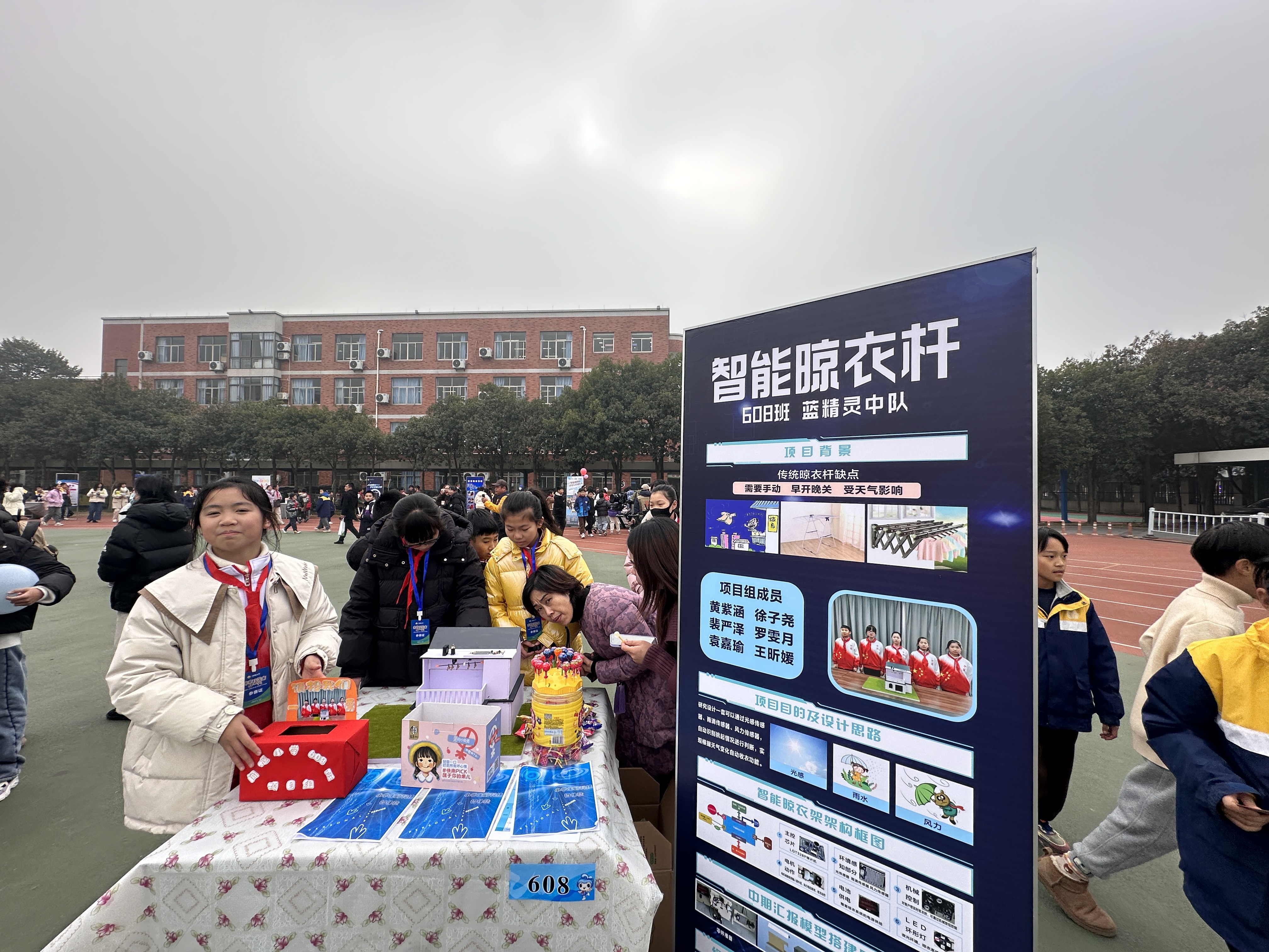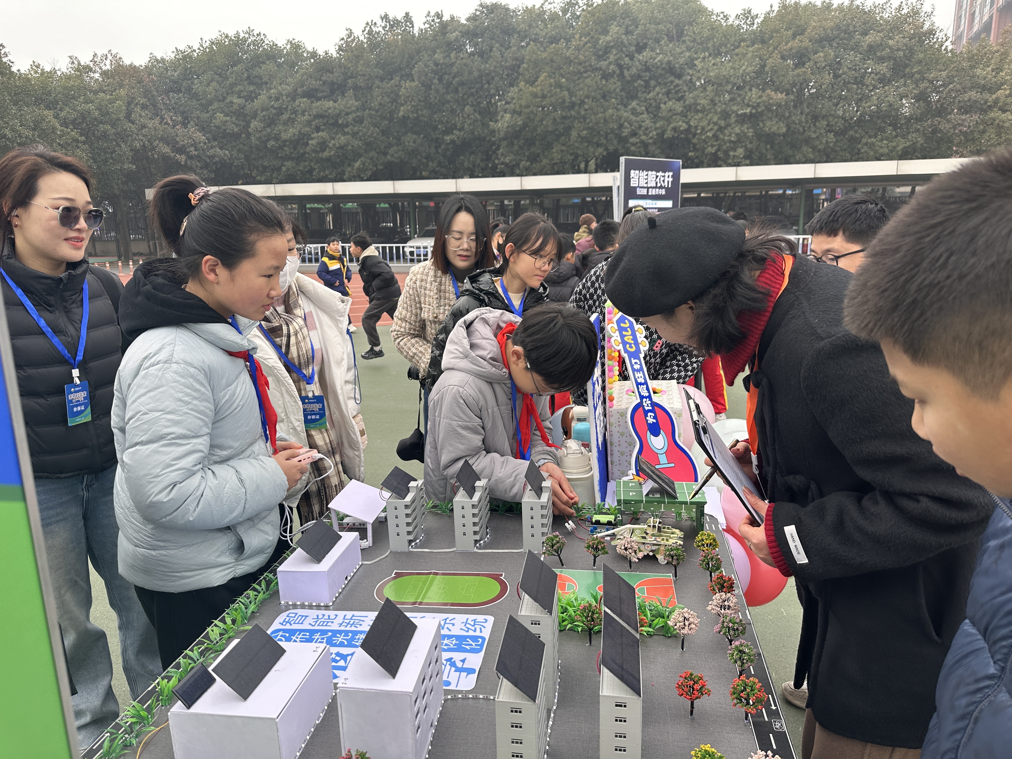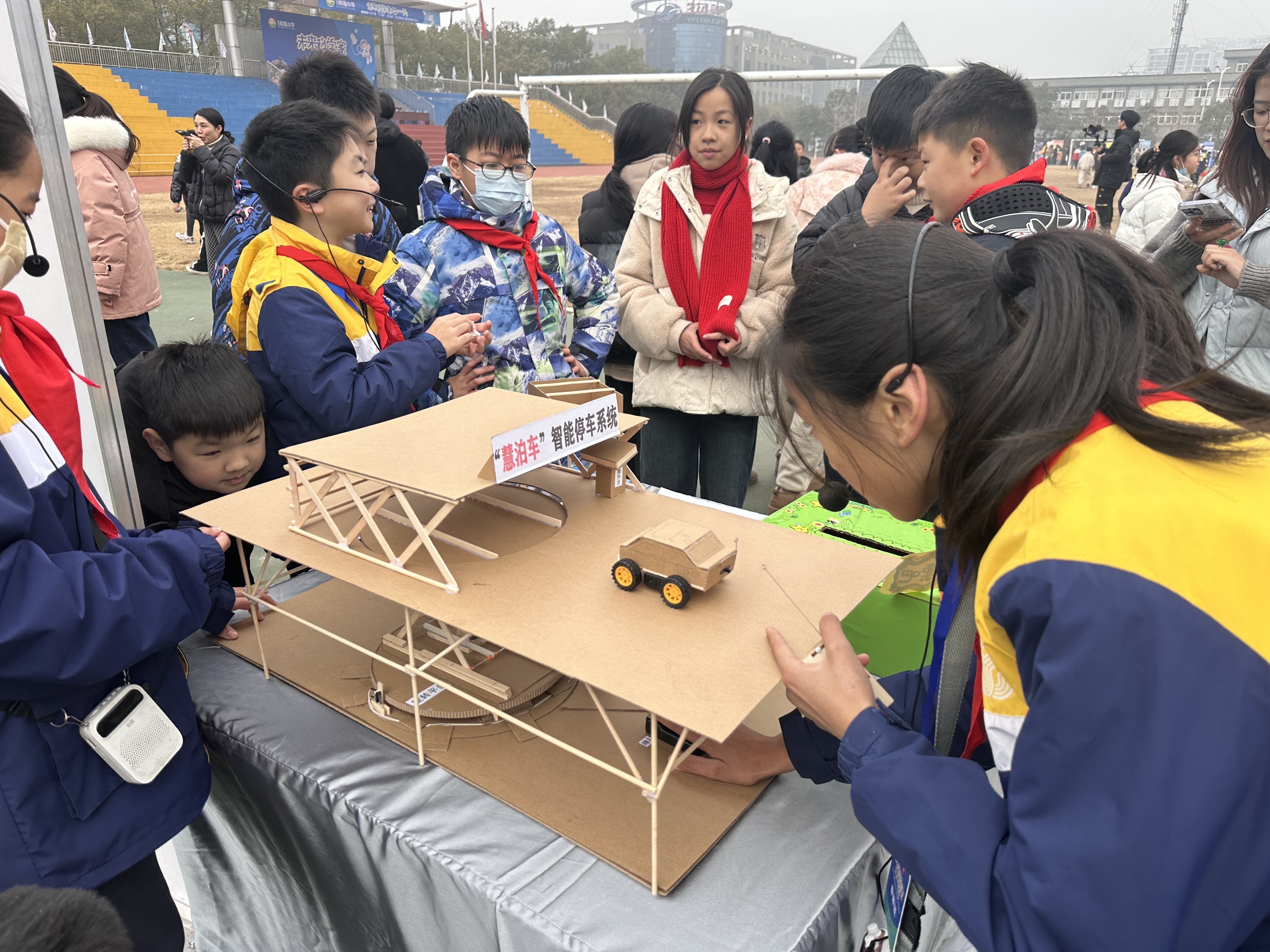 当天,在学校西校区大操场的大型展评活动现场,来自闻堰小学各个年级的58个科创项目组,按年段分批进行了展示。“慧泊车”智能停车系统、智能语音垃圾分类站、智能阳台……各种智能设备和软件集中展示。