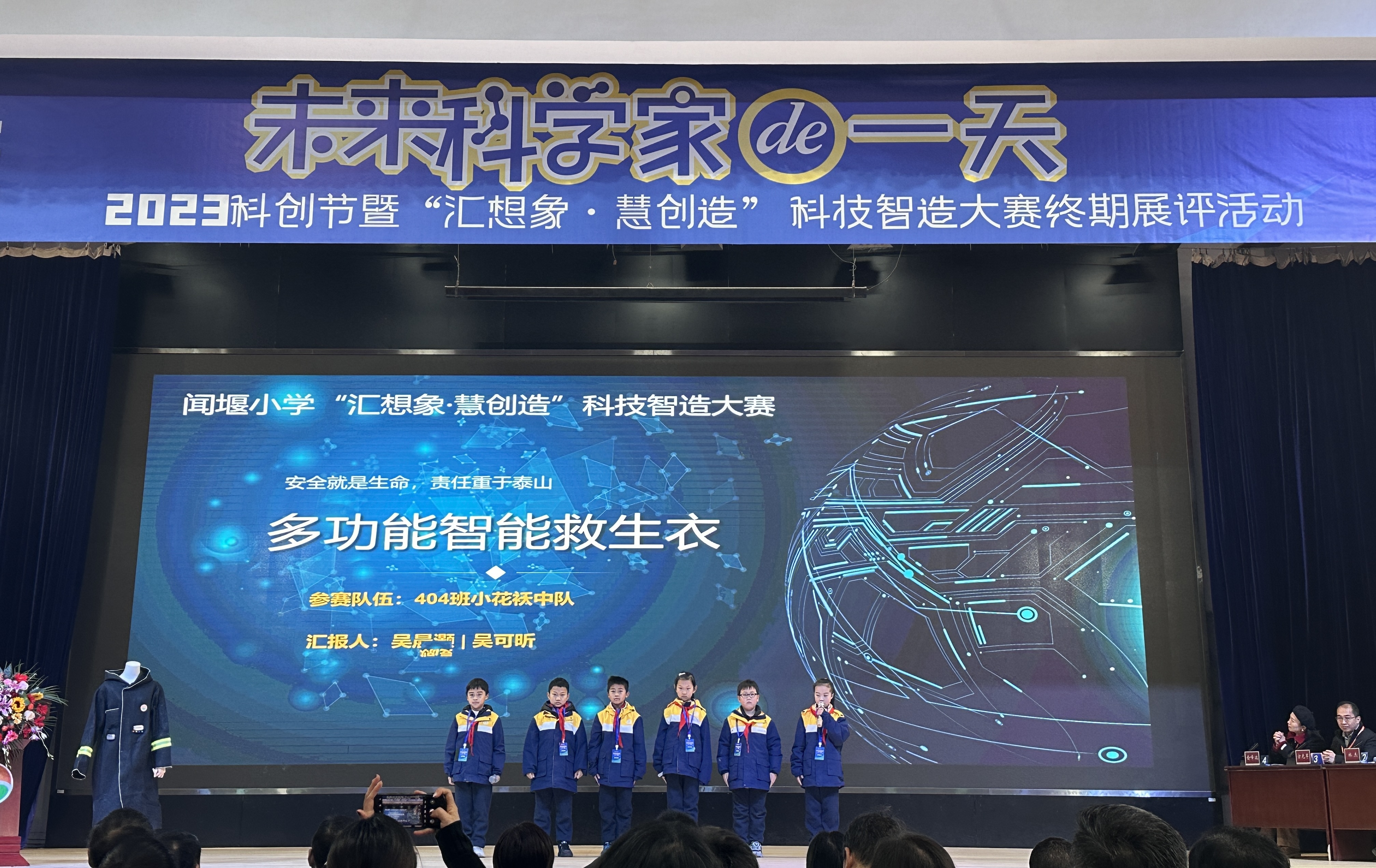 通过随机抽签的方式,312班、404班、507班、603班的科创团队被抽中,上台进行展示。如何让教室内的照明系统,根据室外光线的强弱来自动调节的?消防员闻堰小学312班项目组发明了低碳智能教室照明系统。为了保护消防员的生命安全,404班项目组成员发明了一款《多功能智能救生衣》……