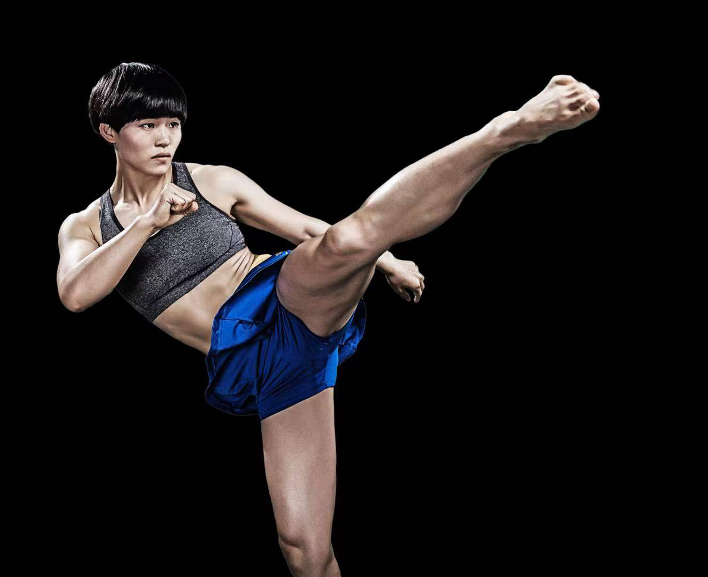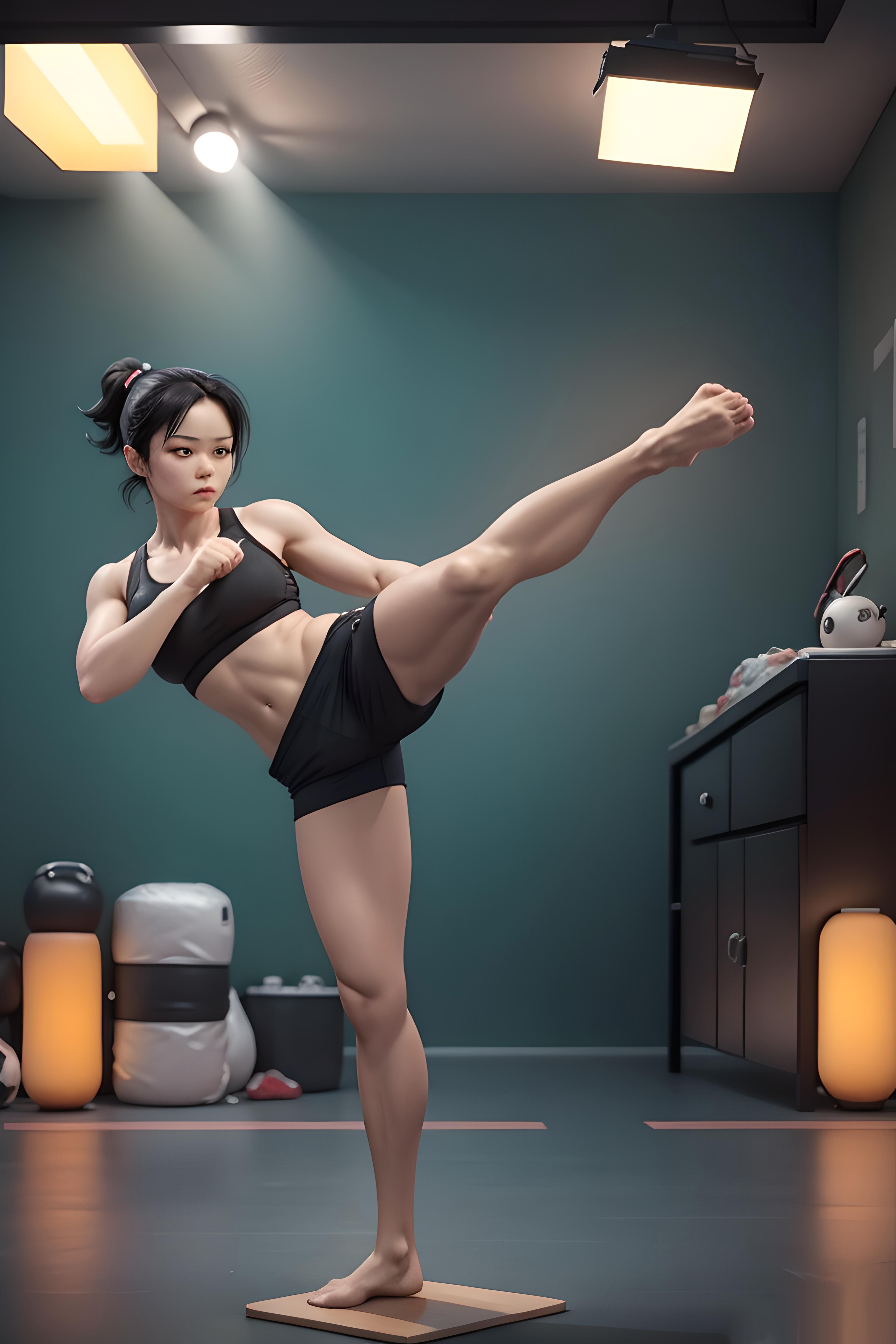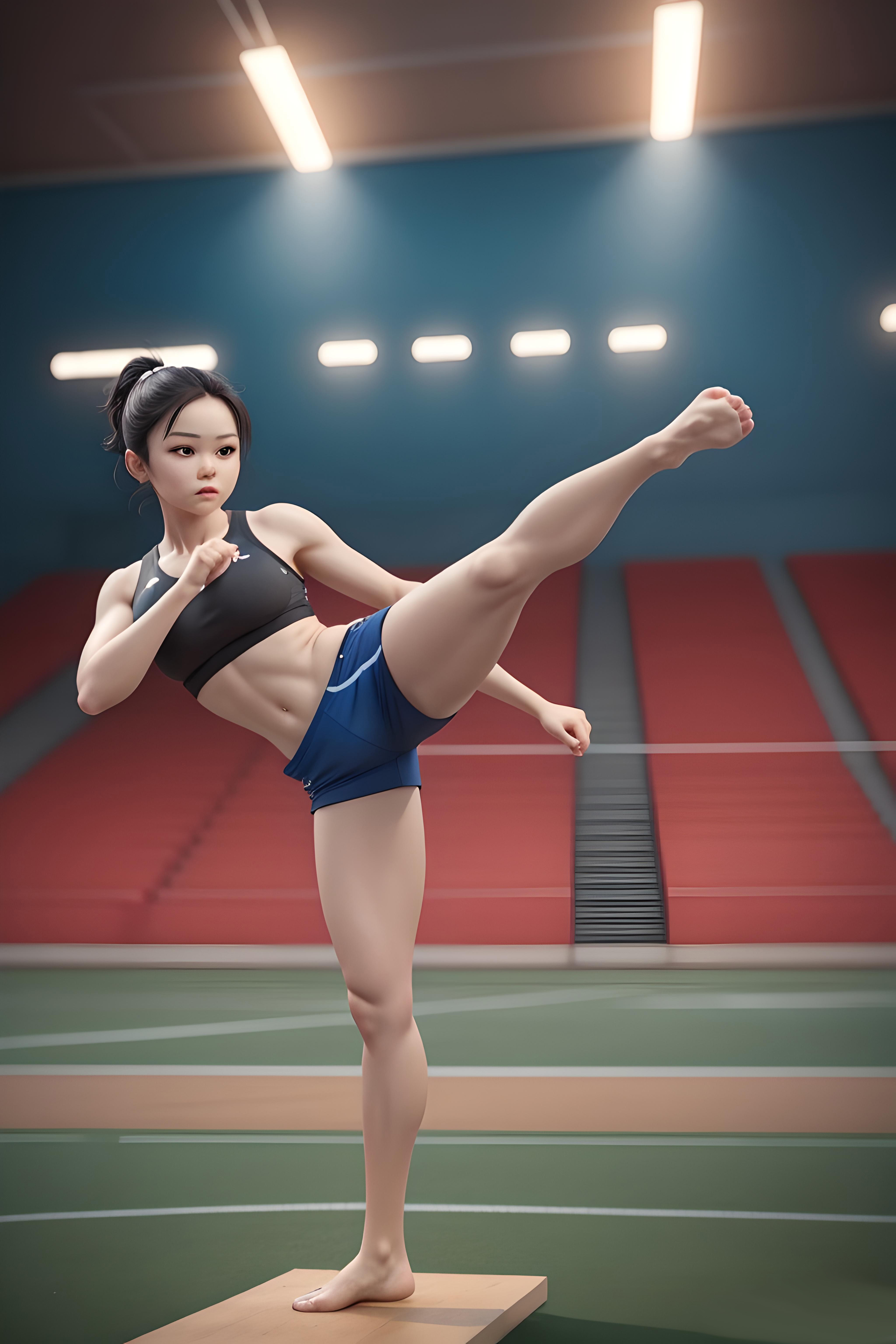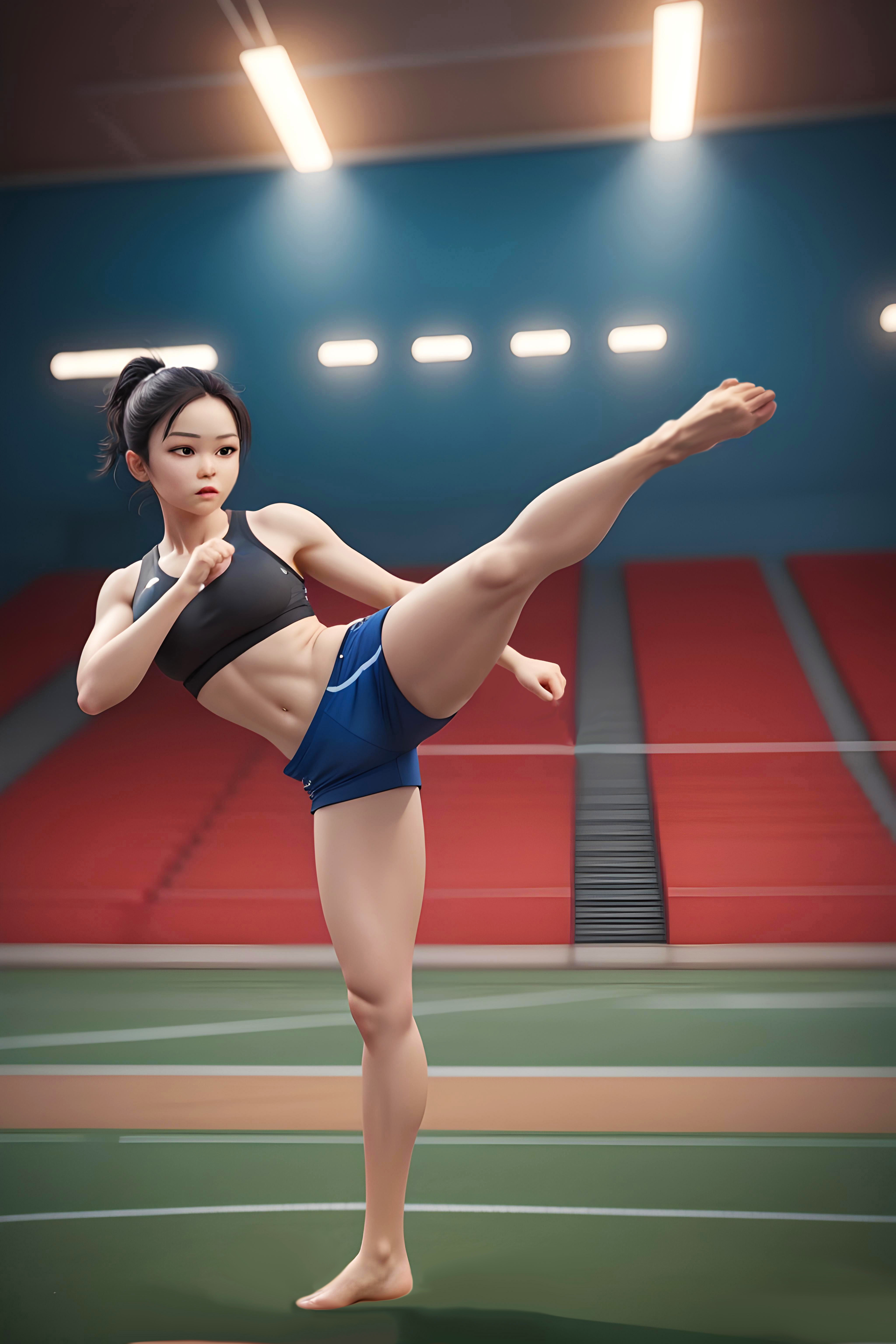 主要提示词:一位女孩,黑色高马尾,身穿黑色、蓝色运动服,光脚丫,专业散打动作,手攥成拳,左腿左脚高抬踢出姿势,身体比例均衡,背景为室内,光线为晚上舞台灯光,高清画质,