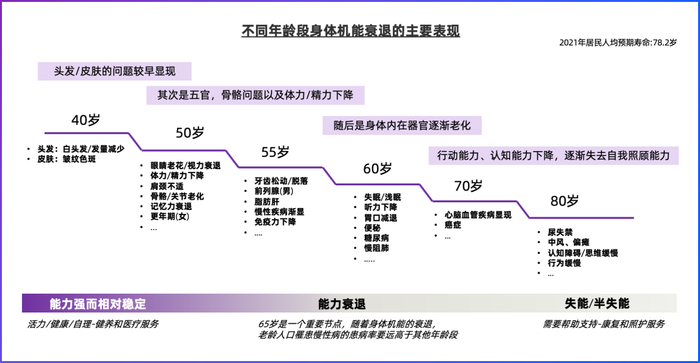 生理机能随着年龄的增长而不断衰退是不可逆的自然规律。但这一过程随着社会稳定、经济成长以及医疗科技的发展,正逐渐趋缓——寿命在延长,健康衰退期在延后。