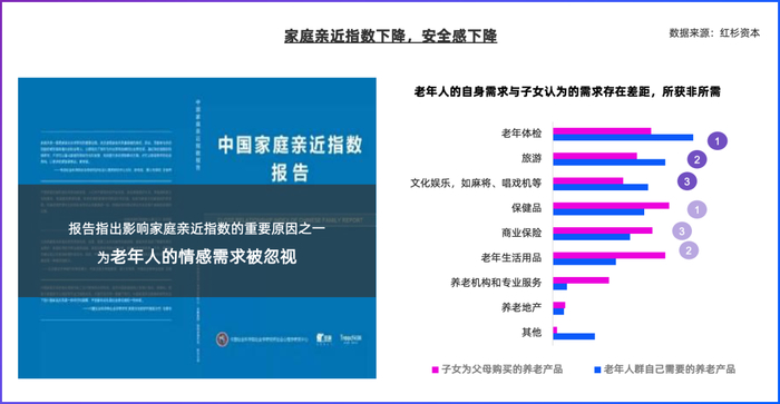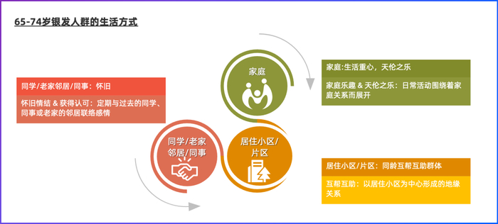 同时,随着中国家庭结构的演进,“小型化”和“少子化”导致独居和空巢现象日趋普遍。老年人在代际交流方面的机会减少,需求不被理解,家庭亲近指数下降,这引发了孤独等一系列心理健康问题。为了减轻这种心理不适,刚退休的银发人群开始积极地将生活重心转移到家庭外部,寻求与外界的更多积极互动。然而,对于更为年长的银发人群来说,受限于收入、教育背景和身体活动能力,他们的生活更多地聚焦于围绕孩子的生活轨迹。