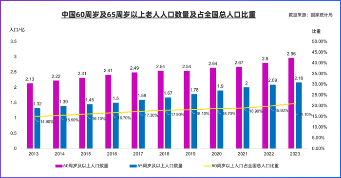 国家统计局发布的最新数据显示,截至2023年末,全国60岁及以上人口达2.9697亿,占全国总人口的21.1%;其中65岁及以上人口达2.1676亿,占全国总人口的15.4%。数据表明,中国正处于中度老龄化社会阶段。