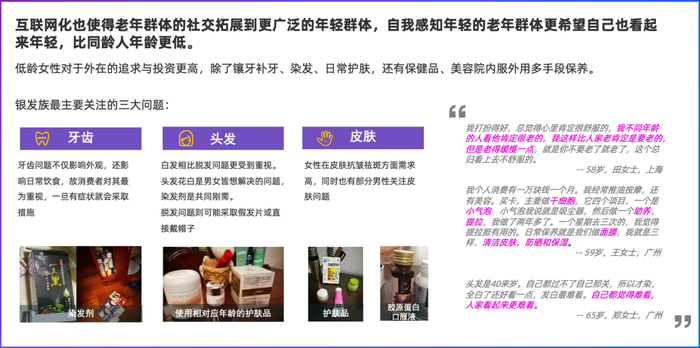 互联网化使得银发人群的社交拓展到更广泛的年轻群体,老年群体希望自己能够看起来年轻,比同龄人年龄更低。打扮已不再是年轻人的专利。如今因为自身喜好、社交需求等原因,有更多的老年人愿意选择收拾好自己后再出门。银发人群尤其关注牙齿、头发和皮肤问题,他们积极采取措施,通过日常饮食、保健品、化妆品、运动甚至医美技术来让自己变美。