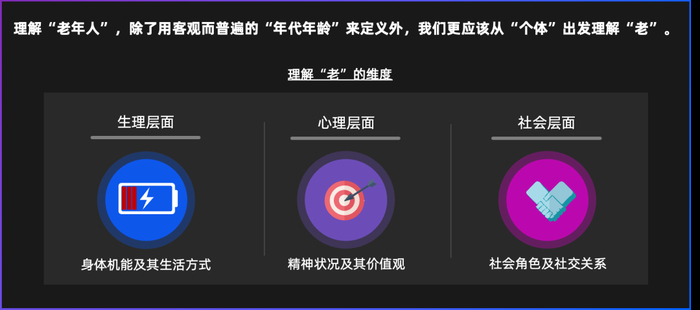 除用客观而普遍的“年代年龄”来定义外,我们更应关注个体差异性,从生理层面、心理层面及社会层面,多维洞察长寿时代下的银发人群。