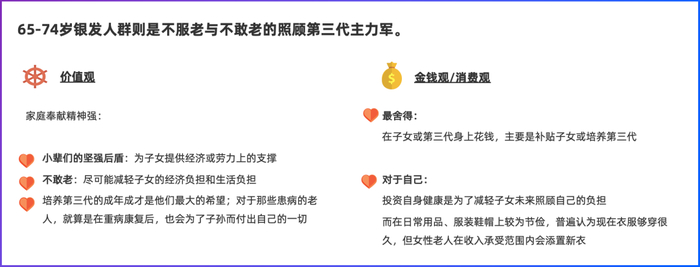 65-74岁的银发人群则家庭奉献精神强,愿意为子女出钱出力,常扮演照顾第三代的角色,表现出不服老、不愿意老的特质。