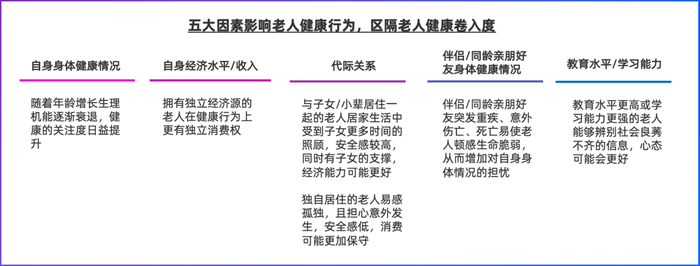 政策宣导下银发人群的养生观念发生转变,他们的健康预防意识增强,健康投资意愿高。银发人群从追求“高寿”转变为追求“健康寿命”,人均采取四到五种不同的健康措施,主要包括:运动锻炼、注意饮食、注意作息睡眠、定期体检。研究显示,身体健康情况、经济水平/收入、代际关系、亲朋好友身体情况及教育水平/学习能力,是主要影响老人健康行为的五大因素。这五点关键因素也区隔开了老人个人差异化的健康卷入度。