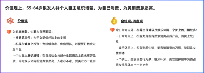 在价值观方面,55-64岁的银发人群区别于其他银发人群最大的特征之一是自主意识强。他们倾向于为自己而消费,追求美好生活品质。