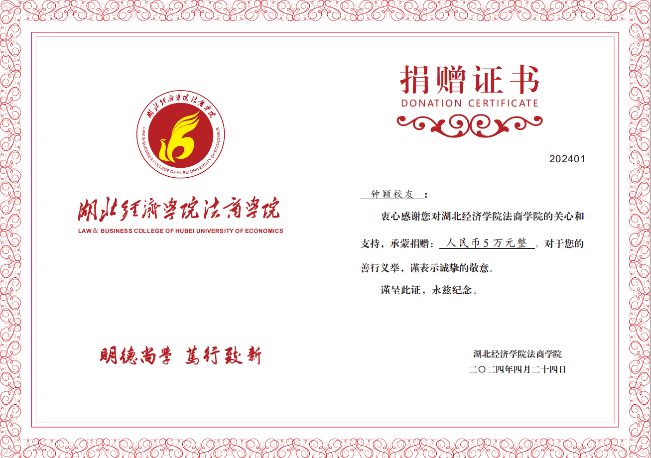 (湖北经济学院法商学院向钟颖颁发捐赠证书)