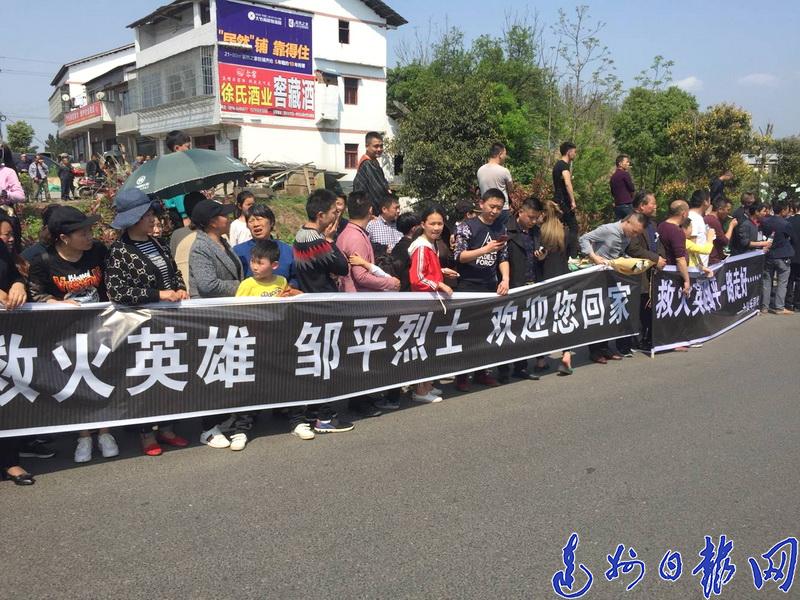 4月6日清晨5点,在家人的陪伴下,扑火英雄邹平的骨灰从西昌市出发,回到故乡大竹县。数十万父老乡亲,在南大梁高速月华出口、在爱国村村头、在街头巷尾,拉着横幅、手持白花、双眼含泪,迎接烈士回家。