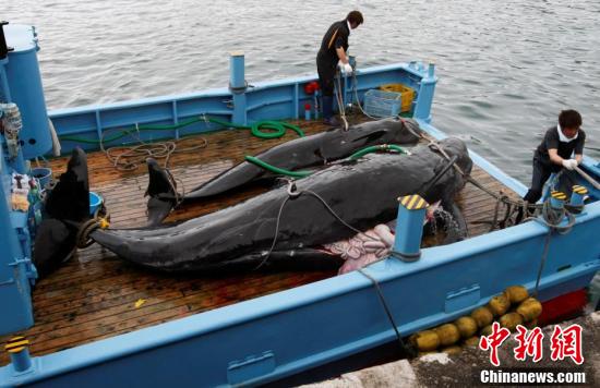 据日本共同社报道,24日,在北海道网走附近鄂霍茨克海进行的日本最后一次科研捕鲸结束了所有日程,1987年开始的日本国内科研捕鲸在持续32年后告终。日本政府30日将退出国际捕鲸委员会(IWC),7月1日起将重启商业捕鲸。图为2008年6月4日,日本东京西南420公里处的太地町,一艘捕鲸船捕获的短鳍领航鲸。(中国新闻网)