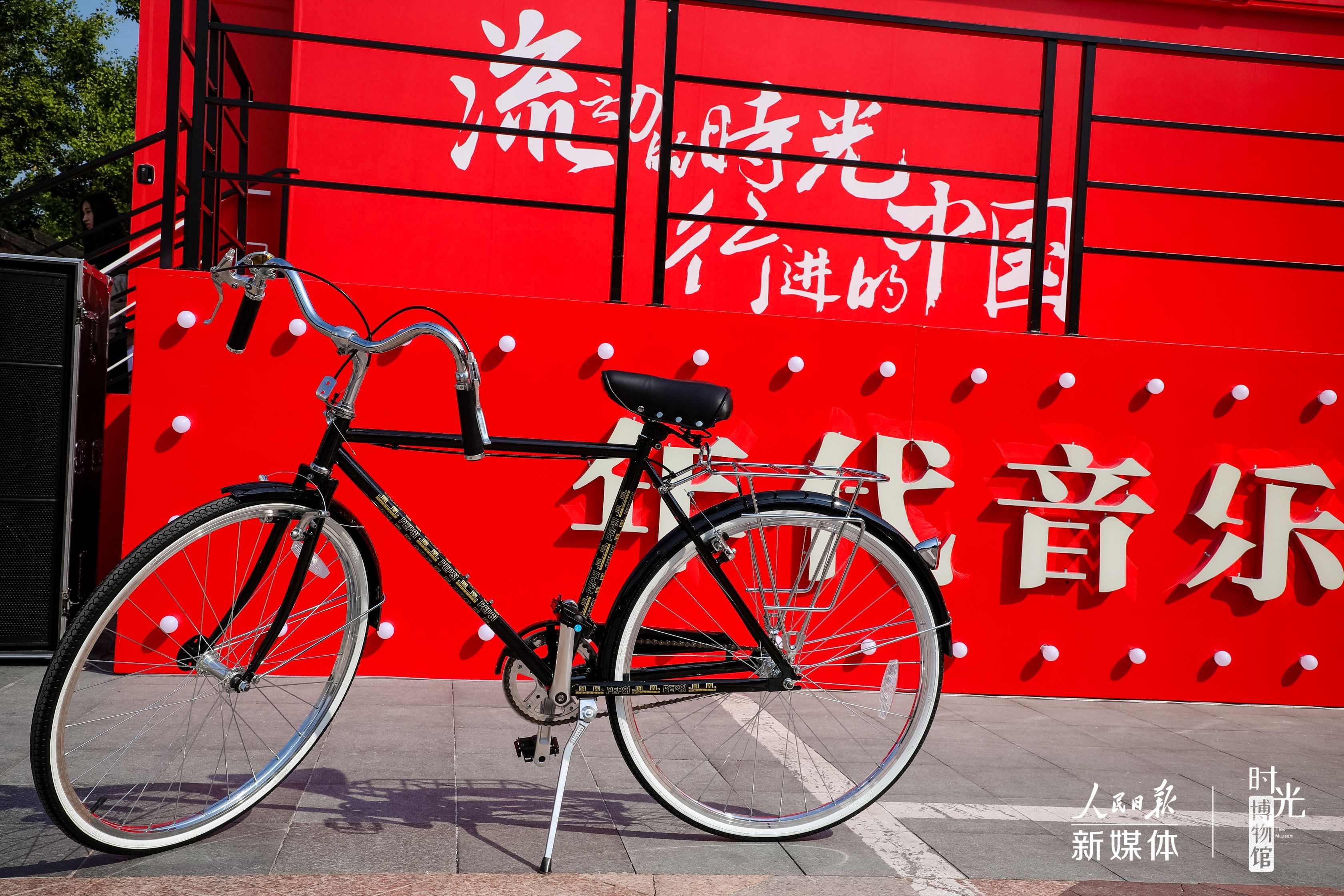 在外场区域,时光博物馆还原了70年来最受民众欢迎的歌曲表演与露天电影等形式,策划了年代音乐秀与时光放映厅两项特别演出,并联合多家品牌发起了时光“报”款联展活动。图片为记忆中的凤凰牌自行车。