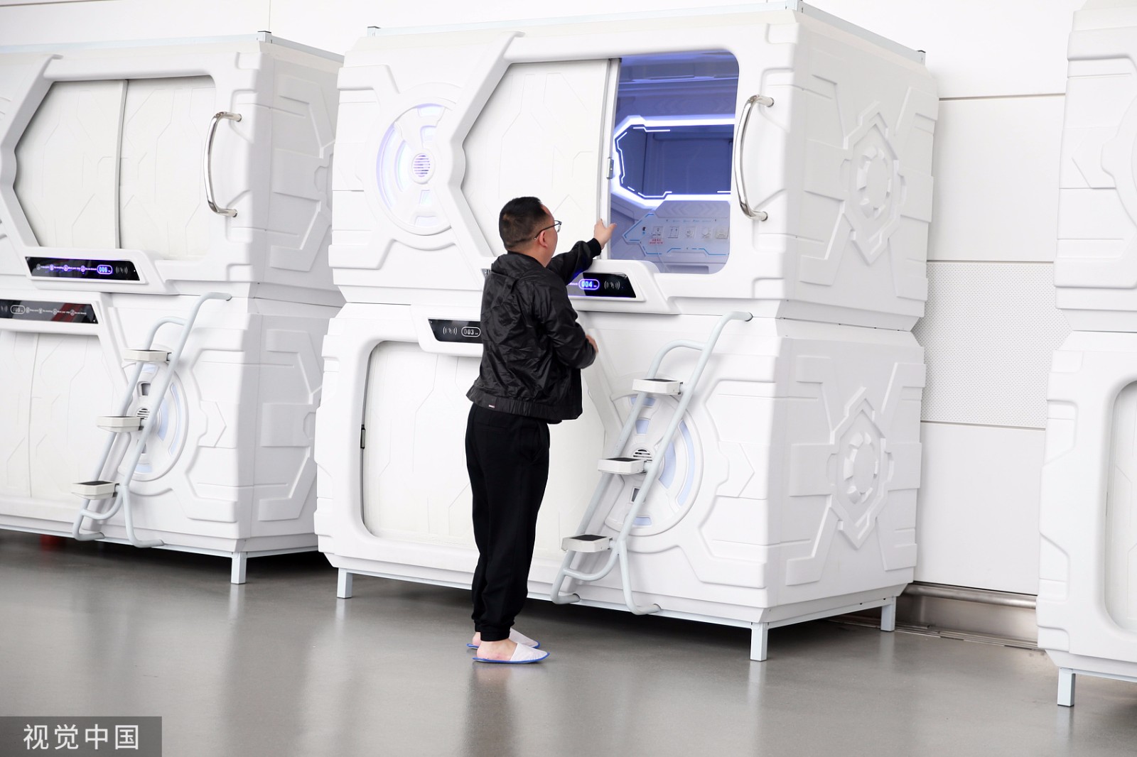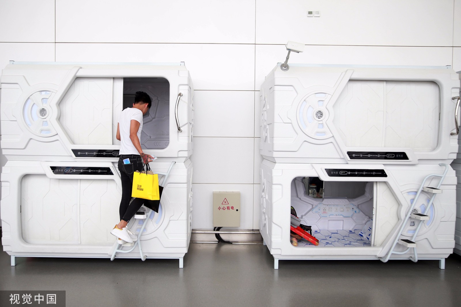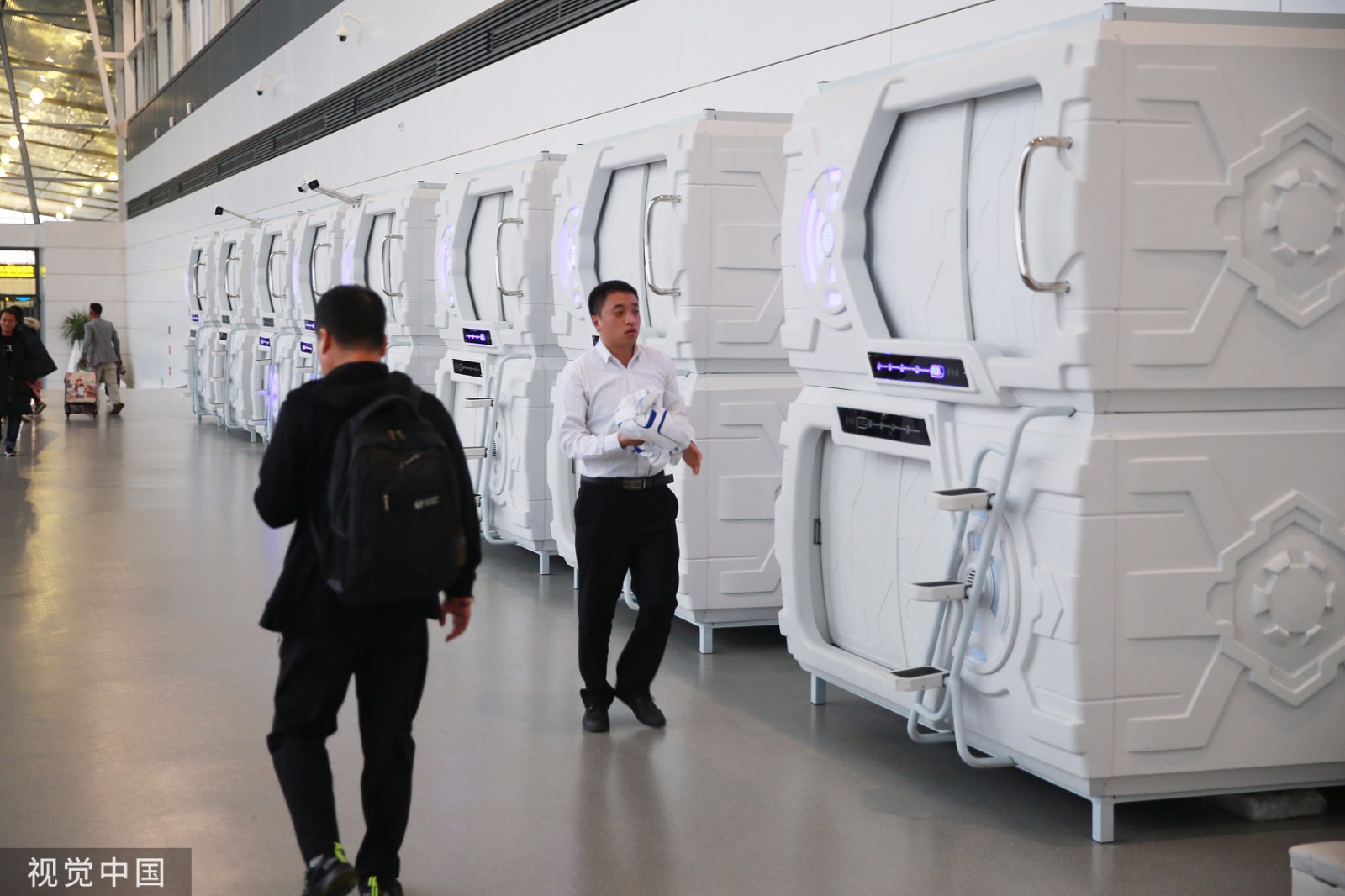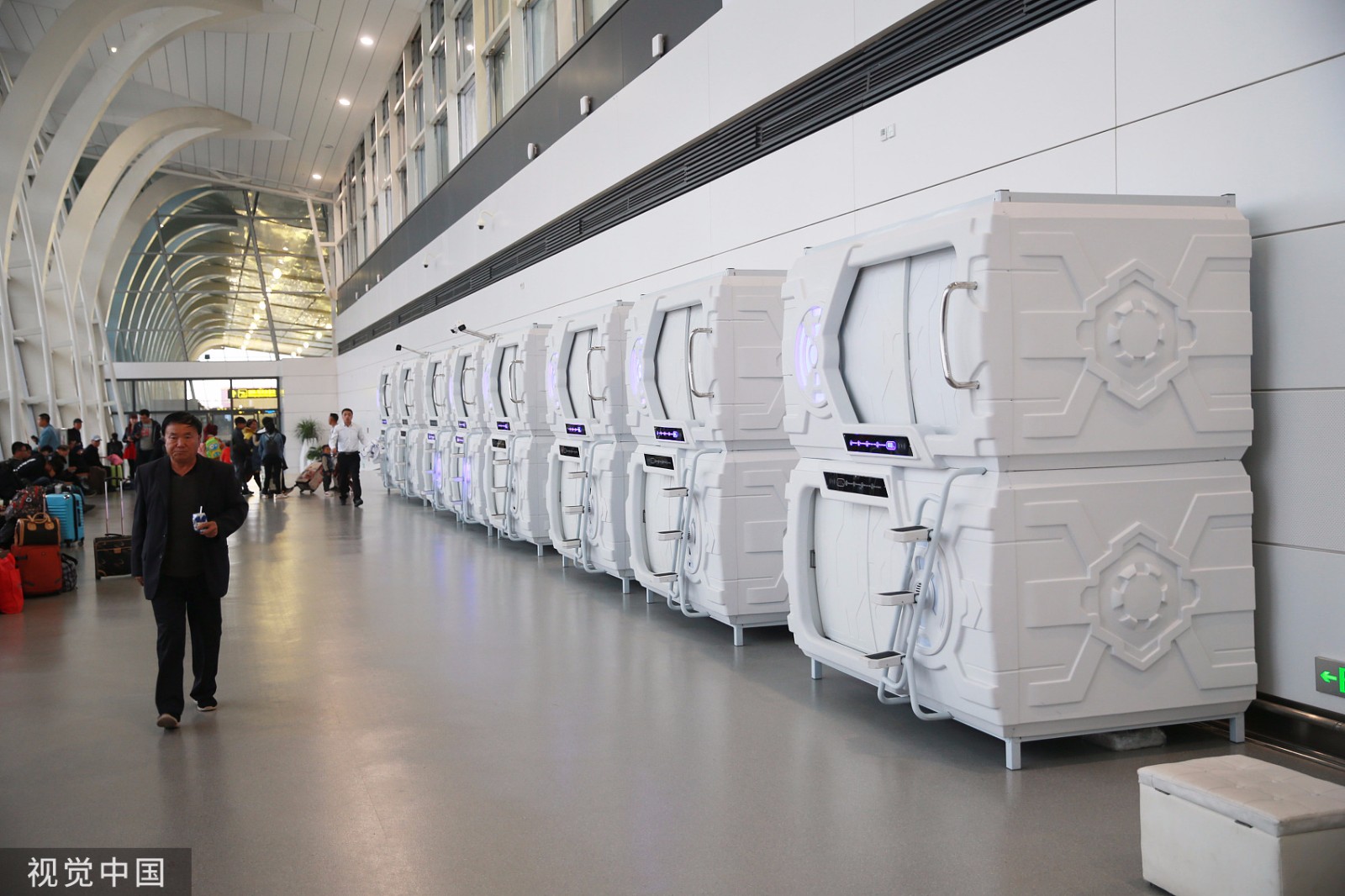 2019年10月23日,银川。近日,一批外形酷似太空舱的“胶囊”酒店在银川河东国际机场候机楼上线,供旅客临时休息。(来源:视觉中国)